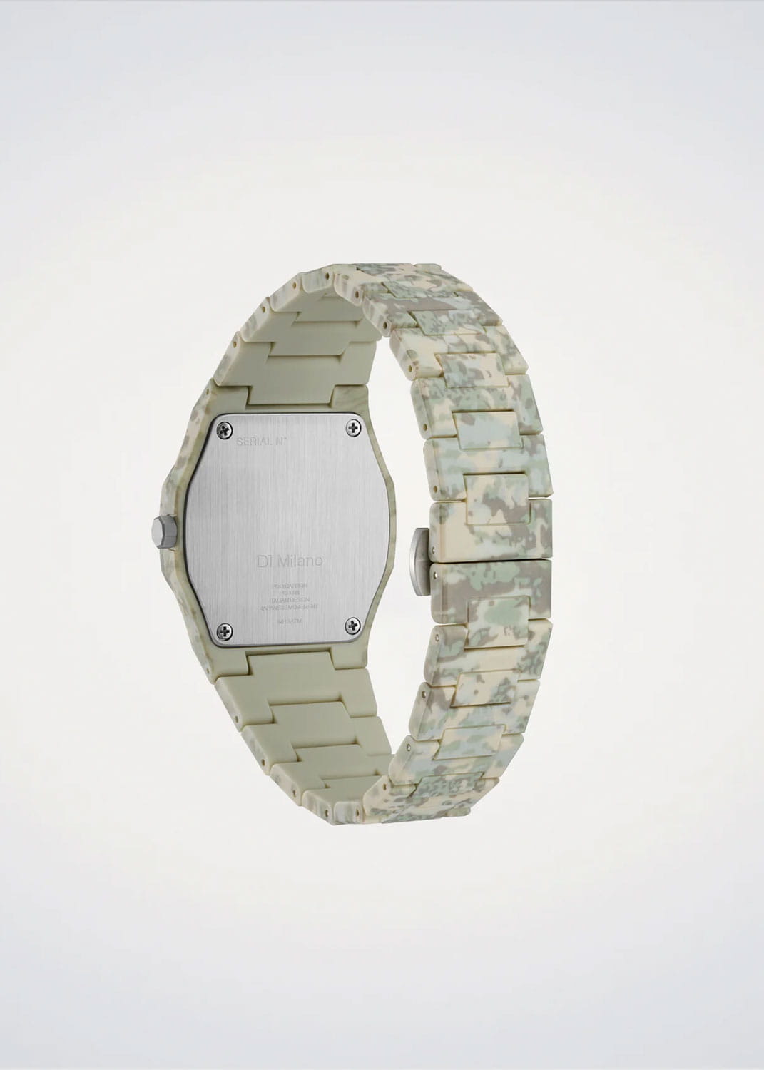 Мужские кварцевые часы D1 Milano Polycarbon PCBJ38 — это стильное сочетание элегантности и современного дизайна. Изящный корпус выполнен из пластика, диаметром 40,5 мм, что придаст образу элегантности и надежности. Изысканный циферблат с метками в виде штрихов придает модели особый блеск. Циферблат защищен минеральным стекломМинеральное стеклоМинеральное стекло представляет собой искусственно выращенный минерал кварца. Такое стекло отличается особой устойчивостью к повреждениям и царапинам. Уступает по некоторым качествам сапфировому стеклу. с антибликовым покрытиемАнтибликовое покрытиеСлой оксида металла в 0,13-0,3 микрон, благодаря которому стекло часов не бликует и не отражает свет. Антибликовое покрытие уменьшает отражение света в 10 раз, обеспечивая отличную читаемость показателей циферблата., обеспечивающий устойчивость к царапинам. Стрелки с люминесцентным покрытиемЛюминесцентное покрытиеПозволяет считывать показания времени в темноте. Производители наносят на стрелки, часовые индексы, безель или поверхность циферблата светонакопительный состав, дающий холодное свечение.. Часы оснащены надежным кварцевым механизмом. Пластиковый браслет на застёжке-бабочке с кнопкамиЗастёжка "бабочка"Такой вид застёжки дополняется предохранителями, помогающими избежать случайного раскрытия браслета. Обладают изящным исполнением. , гарантирует комфортное и безопасное ношение. Класс водозащиты: 50 метров позволит защитить корпус от случайных брызг или капель дождя. Индивидуальный серийный номер. Отличный выбор для тех, кто ценит утонченность и качество.