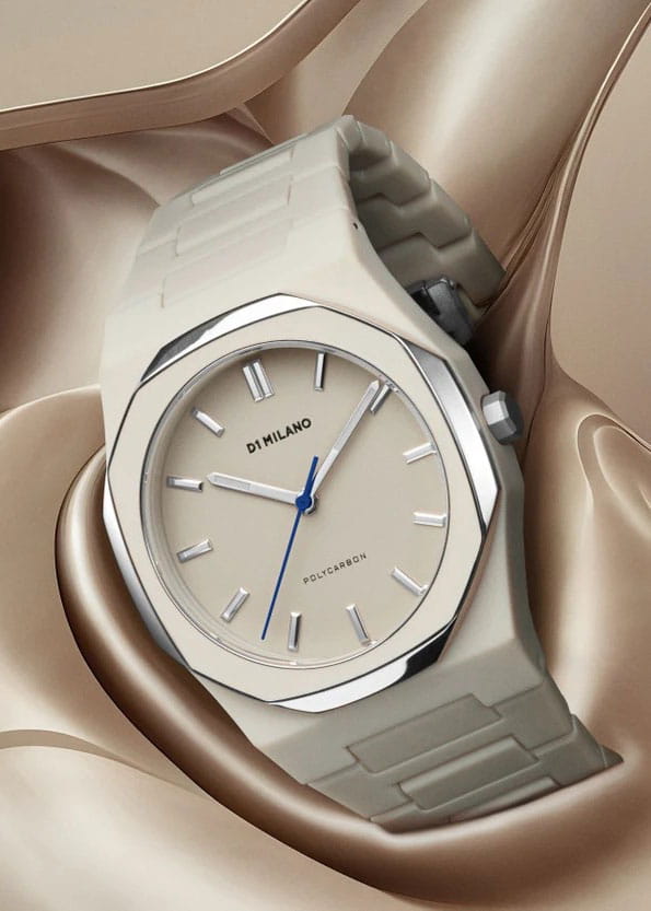 Часы D1 Milano Polycarbon Grey Mesh PCBU16 – современные часы для повседневных образов. Модель имеет серо-бежевый корпус из поликарбоната с покрытием Софт-Тач и полированный стальной безельБезельВнешний ободок, закрепляющий стекло. В спортивных часах так называется поворотное кольцо с делениями на циферблате, выполняет роль таймера – замеряет отрезки времени на шкале. Неподвижный безель – элемент декора. Однонаправленно вращающийся безель на дайверских часах позволяет фиксировать моменты погружения и выныривания на поверхность. с эмалью. Циферблат матовый и лаконичный с индексами в виде штрихов, защищен минеральным стекломМинеральное стеклоМинеральное стекло представляет собой искусственно выращенный минерал кварца. Такое стекло отличается особой устойчивостью к повреждениям и царапинам. Уступает по некоторым качествам сапфировому стеклу. с антибликовым покрытиемАнтибликовое покрытиеСлой оксида металла в 0,13-0,3 микрон, благодаря которому стекло часов не бликует и не отражает свет. Антибликовое покрытие уменьшает отражение света в 10 раз, обеспечивая отличную читаемость показателей циферблата.. Изысканные стрелки выполнены из латуни с люминесцентным покрытиемЛюминесцентное покрытиеПозволяет считывать показания времени в темноте. Производители наносят на стрелки, часовые индексы, безель или поверхность циферблата светонакопительный состав, дающий холодное свечение., гармонично дополняющим общий дизайн модели. Задняя крышка закреплена на 4 винтах, что обеспечивает надежность конструкции. Элегантный пластиковый браслет с покрытием Софт-Тач на застёжке-бабочкеЗастёжка "бабочка"Такой вид застёжки дополняется предохранителями, помогающими избежать случайного раскрытия браслета. Обладают изящным исполнением. . Водозащита 50 метров защищает часы от брызг и дождя, делая их подходящими для повседневного использования. D1 Milano – для тех, кто умеет ценить индивидуальность.