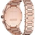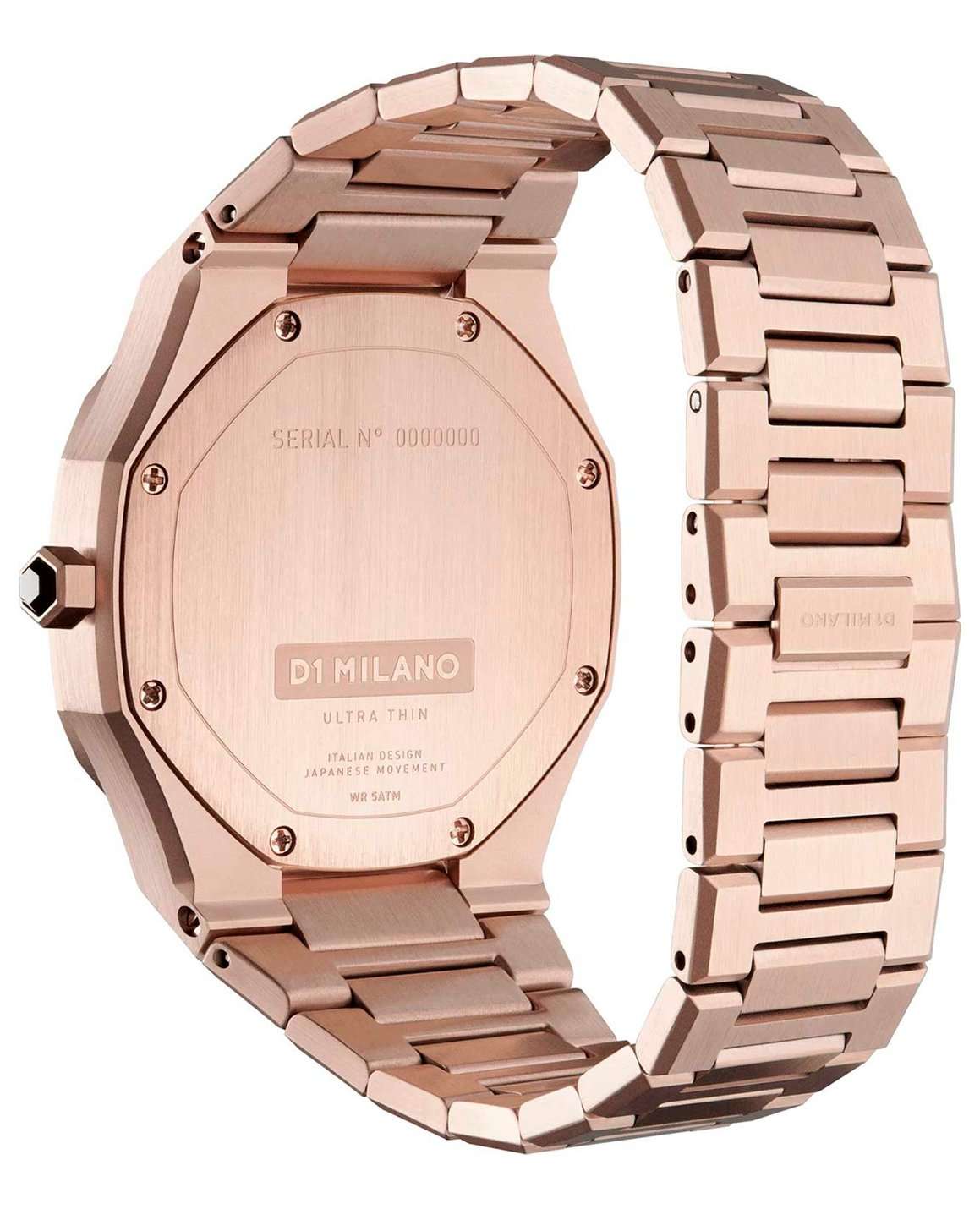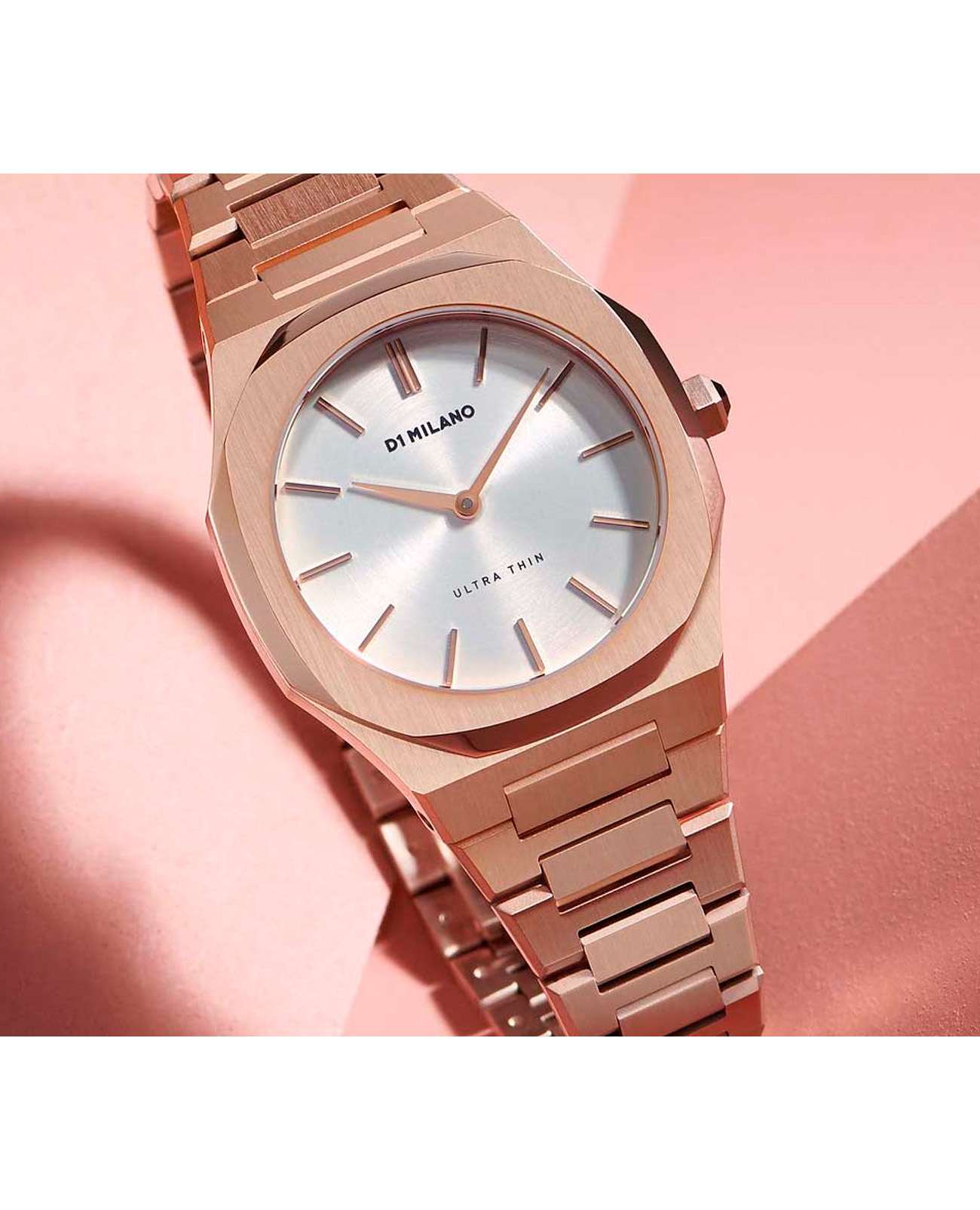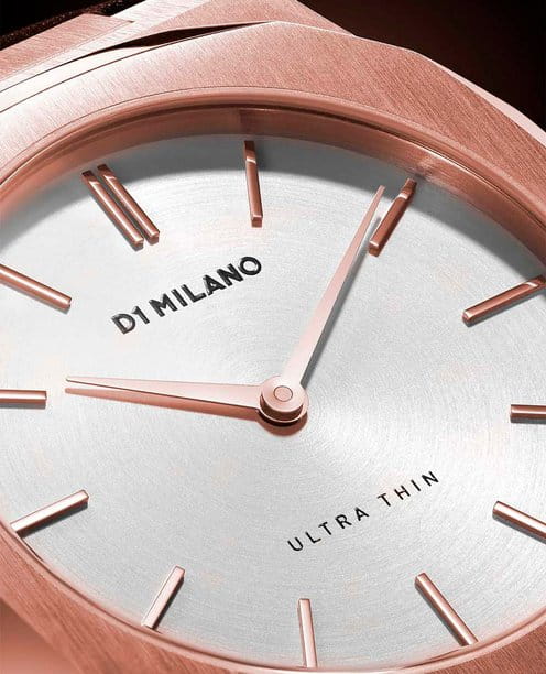 Женские наручные часы D1 Milano UTBL09 из коллекции Ultra Thin сочетают в себе элегантный дизайн и современные технологии. Модель обладает тоннельным корпусом диаметром 34 мм, изготовленным из высококачественной нержавеющей стали 316L с PVD-покрытиемPVDУльтратонкое покрытие наносится в технике вакуумного напыления, сочетает в себе нитрид титана особой прочности со слоем золота или оксида хрома. Несёт в себе декоративную или защитную функцию. в розовое золото, что обеспечивает устойчивость к внешним воздействиям. Толщина ультратонкого корпуса составляет всего 6 мм, делая аксессуар легким и удобным для повседневного использования. Браслет также выполнен из нержавеющей стали с раскладной застежкойРаскладной замокДанный вариант застежки используется только на часах с металлическим браслетом. Отличительная особенность такого крепления в том, что длина браслета становится универсальной и вы можете самостоятельно отрегулировать нужный вам размер – застежка просто двигается по браслету часов., гарантирующей комфортное ношение и безопасность. Циферблат цвета "розовое облако" украшен метками в виде штрихов и оснащен стрелочным механизмом в тон корпуса, который подчеркивает элегантность модели. Для защиты используется сапфировое стеклоСапфировое стеклоПрочный и надёжный материал из кристалла сапфира синтетического происхождения, характеризующийся особой твёрдостью и устойчивостью к царапинам и повреждениям., обеспечивающее прочную защиту от царапин и бликов. Часы работают на кварцевом механизме Miyota 1L22, гарантирующем точность хода без необходимости регулярного подзавода. Водонепроницаемость часов достигает 5 атмосфер (50 метров), что позволяет использовать их во время мытья рук или плавания, однако не рекомендуется для глубоководного дайвинга.