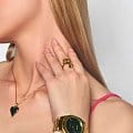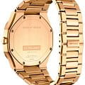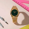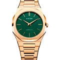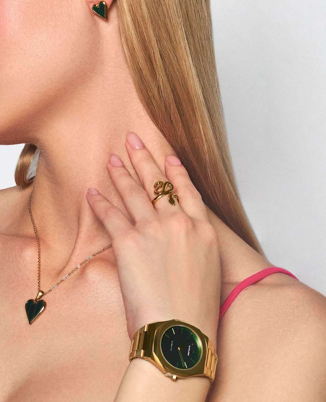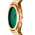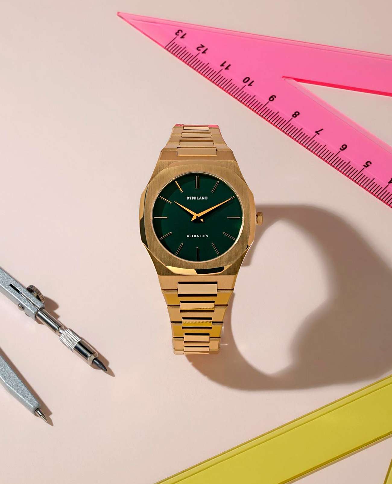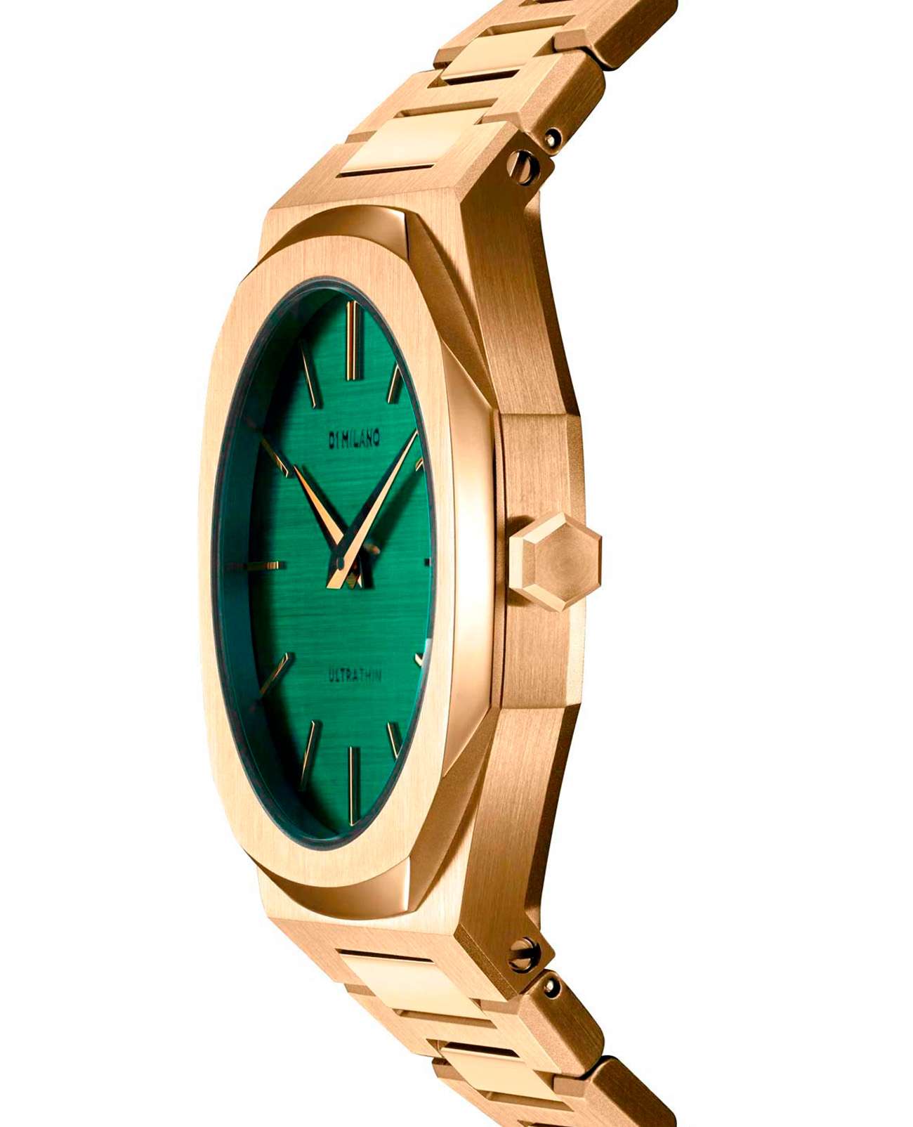 Женские наручные часы D1 Milano UTBL18 из коллекции Ultra Thin сочетают в себе элегантный дизайн и современные технологии. Модель обладает круглым корпусом диаметром 34 мм, изготовленным из высококачественной нержавеющей стали с PVD-покрытиемPVDУльтратонкое покрытие наносится в технике вакуумного напыления, сочетает в себе нитрид титана особой прочности со слоем золота или оксида хрома. Несёт в себе декоративную или защитную функцию., что обеспечивает устойчивость к внешним воздействиям. Толщина ультратонкого корпуса составляет всего 6,2 мм, делая аксессуар легким и удобным для повседневного использования. Браслет выполнен из того же материала с раскладной застежкойРаскладной замокДанный вариант застежки используется только на часах с металлическим браслетом. Отличительная особенность такого крепления в том, что длина браслета становится универсальной и вы можете самостоятельно отрегулировать нужный вам размер – застежка просто двигается по браслету часов., гарантирующей комфортное ношение и безопасность. Циферблат глубокого изумрудно-зеленого цвета с текстурой льна украшен метками в виде штрихов и оснащен стрелочным механизмом в тон корпуса, который подчеркивает элегантность модели. Для защиты используется сапфировое стеклоСапфировое стеклоПрочный и надёжный материал из кристалла сапфира синтетического происхождения, характеризующийся особой твёрдостью и устойчивостью к царапинам и повреждениям., обеспечивающее прочную защиту от царапин и бликов. Часы работают на кварцевом механизме, гарантирующем точность хода без необходимости регулярного подзавода. Водонепроницаемость часов достигает 5 атмосфер (50 метров), что позволяет использовать их во время мытья рук или плавания, однако не рекомендуется для глубоководного дайвинга.