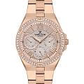 Женские кварцевые часы Daniel Klein — это изысканный аксессуар, завершающий безупречный образ. Корпус диаметром 35 мм выполнен из металла с IP-покрытиемIP-покрытиеМетод ионного напыления. Демонстрирует повышенную устойчивость к истиранию, окислению и химическим веществам. Под воздействием высокого давления и температуры около 1500°C молекулы металла надёжно соединяются с частицами корпуса часов. цвета розового золота. БезельБезельВнешний ободок, закрепляющий стекло. В спортивных часах так называется поворотное кольцо с делениями на циферблате, выполняет роль таймера – замеряет отрезки времени на шкале. Неподвижный безель – элемент декора. Однонаправленно вращающийся безель на дайверских часах позволяет фиксировать моменты погружения и выныривания на поверхность. с декоративными винтами инкрустирован кристаллами. Циферблат розового цвета гильошированный, оформлен штрихами, римскими цифрами и стрелками с люминесцентным покрытиемЛюминесцентное покрытиеПозволяет считывать показания времени в темноте. Производители наносят на стрелки, часовые индексы, безель или поверхность циферблата светонакопительный состав, дающий холодное свечение.. Присутствуют отдельные индикаторы дня недели и даты, а также 24-часовой формат времени. Циферблат защищён минеральным стекломМинеральное стеклоМинеральное стекло представляет собой искусственно выращенный минерал кварца. Такое стекло отличается особой устойчивостью к повреждениям и царапинам. Уступает по некоторым качествам сапфировому стеклу.. Механизм — японский кварцевый, калибр Seiko TMI Epson VX3JE1. Заводная головка рифлёная, с защитой. Часы оснащены стальным браслетом с IP-покрытиемIP-покрытиеМетод ионного напыления. Демонстрирует повышенную устойчивость к истиранию, окислению и химическим веществам. Под воздействием высокого давления и температуры около 1500°C молекулы металла надёжно соединяются с частицами корпуса часов. на раскладной застёжкеРаскладная застёжкаТакой тип застёжки используется только на браслетах из металла. Она никогда не раскрывается полностью, происходит разделение на 2 и более частей. Раскладывающая застёжка снизит вероятность потери часов к минимуму.. Водонепроницаемость 30 м позволяет использовать часы в повседневных условиях. Идеальный выбор для тех, кто ценит турецкое качество и элегантный дизайн.