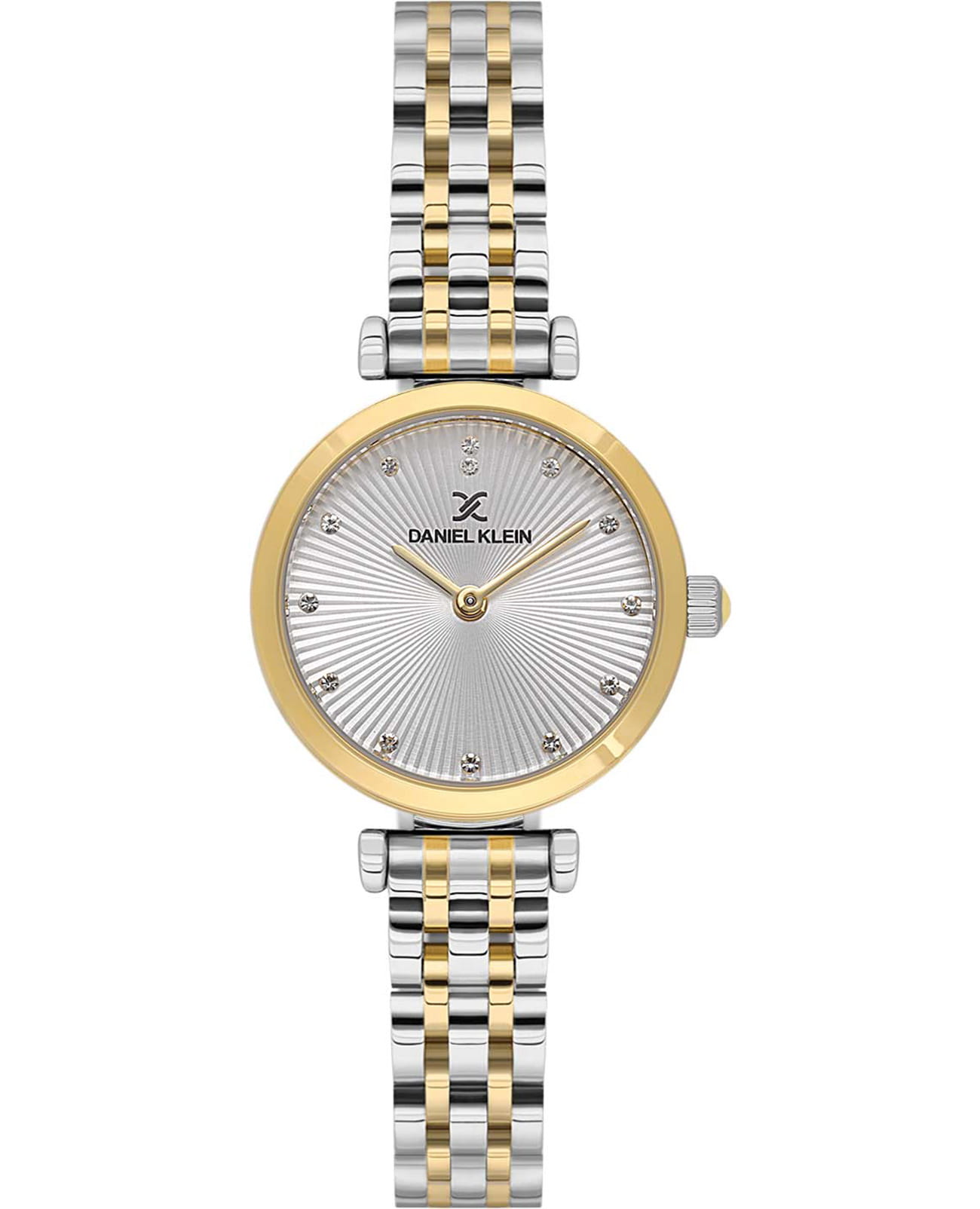 Женские кварцевые часы Daniel Klein — это прекрасный аксессуар для любых приключений. Корпус диаметром 28 мм выполнен из нержавеющей стали. БезельБезельВнешний ободок, закрепляющий стекло. В спортивных часах так называется поворотное кольцо с делениями на циферблате, выполняет роль таймера – замеряет отрезки времени на шкале. Неподвижный безель – элемент декора. Однонаправленно вращающийся безель на дайверских часах позволяет фиксировать моменты погружения и выныривания на поверхность. с IP-покрытиемIP-покрытиеМетод ионного напыления. Демонстрирует повышенную устойчивость к истиранию, окислению и химическим веществам. Под воздействием высокого давления и температуры около 1500°C молекулы металла надёжно соединяются с частицами корпуса часов.. Циферблат серебристого цвета гильошированный, оформлен точками с кристаллами и стрелками. Циферблат защищён минеральным стекломМинеральное стеклоМинеральное стекло представляет собой искусственно выращенный минерал кварца. Такое стекло отличается особой устойчивостью к повреждениям и царапинам. Уступает по некоторым качествам сапфировому стеклу.. Часы оснащены стальным браслетом с частичным IP-покрытиемIP-покрытиеМетод ионного напыления. Демонстрирует повышенную устойчивость к истиранию, окислению и химическим веществам. Под воздействием высокого давления и температуры около 1500°C молекулы металла надёжно соединяются с частицами корпуса часов. на раскладной застёжкеРаскладная застёжкаТакой тип застёжки используется только на браслетах из металла. Она никогда не раскрывается полностью, происходит разделение на 2 и более частей. Раскладывающая застёжка снизит вероятность потери часов к минимуму.. Водонепроницаемость 30 м позволяет использовать часы в повседневных условиях. Идеальный выбор для тех, кто ценит турецкое качество и элегантный дизайн.
