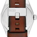 Мужские наручные часы с минеральным стекломМинеральное стеклоМинеральное стекло представляет собой искусственно выращенный минерал кварца. Такое стекло отличается особой устойчивостью к повреждениям и царапинам. Уступает по некоторым качествам сапфировому стеклу. Diesel Scraper DZ2174, кварцевый механизм с высокой точностью. Класс водозащиты: 50 метров, позволит защитить корпус от случайных брызг или капель дождя. Круглый корпус часов изготовлен из стали. Кожаный ремешок на стандартной застёжке. Метки в виде штрихов и арабских цифр. Циферблат выполнен по технологии Sunray (солнечные лучи). Стрелки и метки с люминесцентным покрытиемЛюминесцентное покрытиеПозволяет считывать показания времени в темноте. Производители наносят на стрелки, часовые индексы, безель или поверхность циферблата светонакопительный состав, дающий холодное свечение..