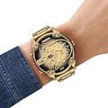 Мужские кварцевые часы Diesel Mr. Daddy 2.0 DZ7490 — это многофункциональный аксессуар, сочетающий в себе стиль и технические возможности. Модель оснащена хронографомХронографФункция позволяет измерять отрезки времени с особой точностью: часы, минуты, секунды. Верным признаком хронографа является наличие на циферблате 3 дополнительных окошек-счётчиков. с секундомеромСекундомерСекундоме́р — прибор, способный измерять интервалы времени с точностью до долей секунды., что делает её удобной для измерения времени с высокой точностью. Циферблат золотистого цвета, а его дизайн включает штриховые метки, а также окошко даты в положении 3 часов. Защиту циферблата обеспечивает Минеральное стеклоМинеральное стеклоМинеральное стекло представляет собой искусственно выращенный минерал кварца. Такое стекло отличается особой устойчивостью к повреждениям и царапинам. Уступает по некоторым качествам сапфировому стеклу., устойчивое к мелким повреждениям. Корпус диаметром 54 мм выполнен из стали с золотым PVD-покрытиемPVDУльтратонкое покрытие наносится в технике вакуумного напыления, сочетает в себе нитрид титана особой прочности со слоем золота или оксида хрома. Несёт в себе декоративную или защитную функцию., включающим матовые и полированные детали. Стальной браслет с золотым PVD-покрытиемPVDУльтратонкое покрытие наносится в технике вакуумного напыления, сочетает в себе нитрид титана особой прочности со слоем золота или оксида хрома. Несёт в себе декоративную или защитную функцию. оснащён раскладной застёжкойРаскладная застёжкаТакой тип застёжки используется только на браслетах из металла. Она никогда не раскрывается полностью, происходит разделение на 2 и более частей. Раскладывающая застёжка снизит вероятность потери часов к минимуму. с двумя кнопками, обеспечивающей комфорт и надёжную фиксацию на запястье. Водонепроницаемость 30WR позволяет использовать модель при мытье рук или под лёгким дождём. Эти часы станут универсальным аксессуаром для тех, кто ценит сочетание функциональности, эстетики и надёжности — идеальный выбор для повседневного использования и активного образа жизни.