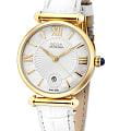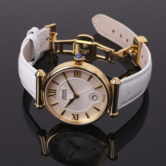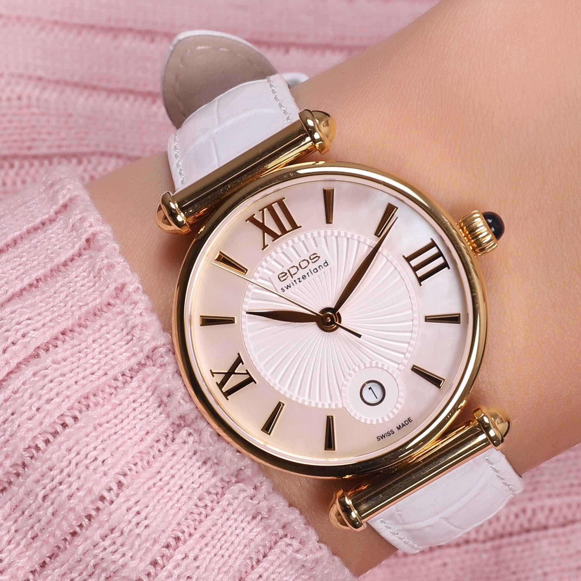 Женские кварцевые часы Epos из коллекции Ladies Quartz — это элегантный аксессуар, сочетающий швейцарское качество и изысканный дизайн. Корпус диаметром 34 мм и толщиной 7 мм выполнен из нержавеющей стали 316L с PVD-покрытиемPVDУльтратонкое покрытие наносится в технике вакуумного напыления, сочетает в себе нитрид титана особой прочности со слоем золота или оксида хрома. Несёт в себе декоративную или защитную функцию.. Циферблат с перламутровой вставкой и центральной частью белого цвета с гильошированием «солнечные лучи» оформлен римскими цифрами и метками. Циферблат защищён сапфировым стекломСапфировое стеклоПрочный и надёжный материал из кристалла сапфира синтетического происхождения, характеризующийся особой твёрдостью и устойчивостью к царапинам и повреждениям.. Заводная головка украшена синим кабошоном. Окошко даты расположено в положении 6 часов. Механизм — швейцарский кварцевый калибр Ronda 705. Часы оснащены кожаным ремешком белого цвета с тиснением под аллигатора и застёжкой «бабочка» с кнопкамиЗастёжка "бабочка"Такой вид застёжки дополняется предохранителями, помогающими избежать случайного раскрытия браслета. Обладают изящным исполнением. . Водонепроницаемость 30 м позволяет использовать часы в повседневных условиях. Гарантия — 24 месяца. Идеальный выбор для тех, кто ценит женственность, стиль и точность.