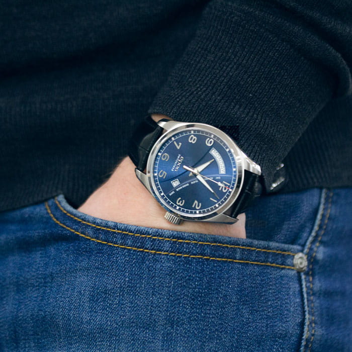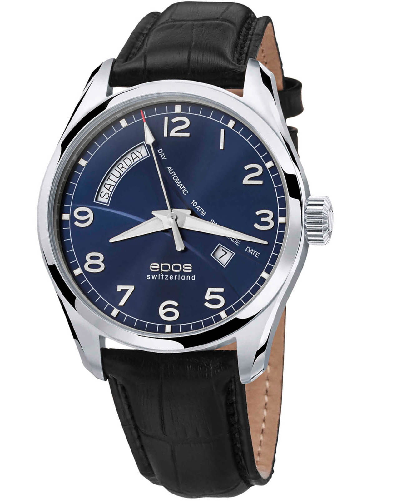 Мужские механические часы с автоподзаводом Epos из коллекции Passion — это сочетание швейцарского мастерства и современного дизайна. Корпус диаметром 43 мм выполнен из нержавеющей стали 316L. Циферблат синего цвета оформлен сатинированным узором «Солнечные лучи» и дополнен окошками даты и дня недели. Циферблат защищён сапфировым стекломСапфировое стеклоПрочный и надёжный материал из кристалла сапфира синтетического происхождения, характеризующийся особой твёрдостью и устойчивостью к царапинам и повреждениям.. Стрелки с люминесцентным покрытиемЛюминесцентное покрытиеПозволяет считывать показания времени в темноте. Производители наносят на стрелки, часовые индексы, безель или поверхность циферблата светонакопительный состав, дающий холодное свечение., обеспечивающим хорошую читаемость в темноте. Механизм — швейцарский калибр ETA 2834 с запасом хода 38 часов. Прозрачная задняя крышка позволяет наблюдать за работой механизма. Часы оснащены кожаным ремешком чёрного цвета со стандартной застёжкой. Водонепроницаемость 100 м позволяет использовать часы для плавания. Гарантия — 24 месяца. Универсальный выбор для ценителя классики и точного механизма.