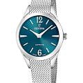Женские кварцевые часы Festina F20076/4 из коллекции Swiss Made — это элегантный аксессуар с швейцарским качеством и изысканным дизайном. Корпус диаметром 32 мм и толщиной 7,3 мм выполнен из нержавеющей стали серебряного цвета. Циферблат синего цвета оформлен минималистично, с тонкими метками. Циферблат защищён сапфировым стекломСапфировое стеклоПрочный и надёжный материал из кристалла сапфира синтетического происхождения, характеризующийся особой твёрдостью и устойчивостью к царапинам и повреждениям.. Заводная головка — вытягивающегося типа, задняя крышка — прижимная. Часы оснащены стальным браслетом миланского плетения с раскладным замкомРаскладной замокДанный вариант застежки используется только на часах с металлическим браслетом. Отличительная особенность такого крепления в том, что длина браслета становится универсальной и вы можете самостоятельно отрегулировать нужный вам размер – застежка просто двигается по браслету часов.. Механизм — кварцевый калибр Ronda 762 с 10-летним сроком службы батареи. Водонепроницаемость 50 м позволяет использовать часы в повседневных условиях, защищая от брызг и дождя. Универсальный выбор для тех, кто ценит лаконичность, стиль и долговечность.