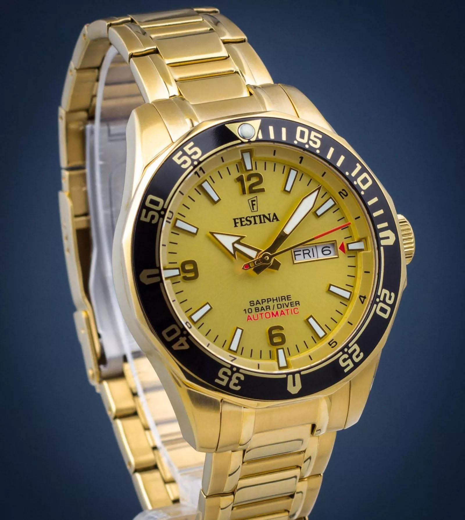 Мужские механические часы Festina Automatic F20479/1, механический механизм (автоматический калибр) с высокой точностью. Сапфировое стеклоСапфировое стеклоПрочный и надёжный материал из кристалла сапфира синтетического происхождения, характеризующийся особой твёрдостью и устойчивостью к царапинам и повреждениям. устойчивое к появлению царапин, обладающее высокой прозрачностью. Класс водозащиты: 100 метров, позволит плавать, нырять и заниматься другими водными видами спорта. Корпус часов изготовлен из стали с IP-покрытиемIP-покрытиеМетод ионного напыления. Демонстрирует повышенную устойчивость к истиранию, окислению и химическим веществам. Под воздействием высокого давления и температуры около 1500°C молекулы металла надёжно соединяются с частицами корпуса часов.. Стальной браслет на раскладной застёжкеРаскладная застёжкаТакой тип застёжки используется только на браслетах из металла. Она никогда не раскрывается полностью, происходит разделение на 2 и более частей. Раскладывающая застёжка снизит вероятность потери часов к минимуму. с IP-покрытиемIP-покрытиеМетод ионного напыления. Демонстрирует повышенную устойчивость к истиранию, окислению и химическим веществам. Под воздействием высокого давления и температуры около 1500°C молекулы металла надёжно соединяются с частицами корпуса часов.. Окошки дня недели и даты находятся в положении 3 часа. БезельБезельВнешний ободок, закрепляющий стекло. В спортивных часах так называется поворотное кольцо с делениями на циферблате, выполняет роль таймера – замеряет отрезки времени на шкале. Неподвижный безель – элемент декора. Однонаправленно вращающийся безель на дайверских часах позволяет фиксировать моменты погружения и выныривания на поверхность. с IP-покрытиемIP-покрытиеМетод ионного напыления. Демонстрирует повышенную устойчивость к истиранию, окислению и химическим веществам. Под воздействием высокого давления и температуры около 1500°C молекулы металла надёжно соединяются с частицами корпуса часов.. Стрелки и метки с люминесцентным покрытиемЛюминесцентное покрытиеПозволяет считывать показания времени в темноте. Производители наносят на стрелки, часовые индексы, безель или поверхность циферблата светонакопительный состав, дающий холодное свечение..