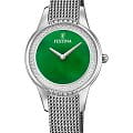 Часы Festina F20494/7 из коллекции Mademoiselle — элегантная женская модель, сочетающая изысканный дизайн и надёжность. Корпус диаметром 30 мм выполнен из нержавеющей стали, украшен декоративными кристаллами на безелеБезельВнешний ободок, закрепляющий стекло. В спортивных часах так называется поворотное кольцо с делениями на циферблате, выполняет роль таймера – замеряет отрезки времени на шкале. Неподвижный безель – элемент декора. Однонаправленно вращающийся безель на дайверских часах позволяет фиксировать моменты погружения и выныривания на поверхность.. Перламутровый циферблат с изящными стрелками и маркерами защищён минеральным стекломМинеральное стеклоМинеральное стекло представляет собой искусственно выращенный минерал кварца. Такое стекло отличается особой устойчивостью к повреждениям и царапинам. Уступает по некоторым качествам сапфировому стеклу..