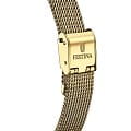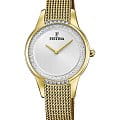 Яркий стиль и функциональность этих часов придутся по душе активной девушке. Кварцевый механизм с высокой точностью. Минеральное стеклоМинеральное стеклоМинеральное стекло представляет собой искусственно выращенный минерал кварца. Такое стекло отличается особой устойчивостью к повреждениям и царапинам. Уступает по некоторым качествам сапфировому стеклу. устойчивое к появлению царапин, обладающее высокой прозрачностью. Класс водозащиты: 50 метров, позволит защитить корпус от случайных брызг или капель дождя. Корпус часов изготовлен из нержавеющей стали 316L с PVDPVDУльтратонкое покрытие наносится в технике вакуумного напыления, сочетает в себе нитрид титана особой прочности со слоем золота или оксида хрома. Несёт в себе декоративную или защитную функцию. покрытием. БезельБезельВнешний ободок, закрепляющий стекло. В спортивных часах так называется поворотное кольцо с делениями на циферблате, выполняет роль таймера – замеряет отрезки времени на шкале. Неподвижный безель – элемент декора. Однонаправленно вращающийся безель на дайверских часах позволяет фиксировать моменты погружения и выныривания на поверхность. украшен цирконами. Браслет с раскладной застёжкойРаскладная застёжкаТакой тип застёжки используется только на браслетах из металла. Она никогда не раскрывается полностью, происходит разделение на 2 и более частей. Раскладывающая застёжка снизит вероятность потери часов к минимуму..