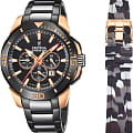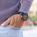 Часы-хронографХронографФункция позволяет измерять отрезки времени с особой точностью: часы, минуты, секунды. Верным признаком хронографа является наличие на циферблате 3 дополнительных окошек-счётчиков.. Кварцевый механизм с высокой точностью. Минеральное стеклоМинеральное стеклоМинеральное стекло представляет собой искусственно выращенный минерал кварца. Такое стекло отличается особой устойчивостью к повреждениям и царапинам. Уступает по некоторым качествам сапфировому стеклу. устойчивое к появлению царапин, обладающее высокой прозрачностью. Класс водозащиты: 100 метров, позволит плавать, нырять и заниматься другими водными видами спорта. Безель с PVD-покрытиемPVDУльтратонкое покрытие наносится в технике вакуумного напыления, сочетает в себе нитрид титана особой прочности со слоем золота или оксида хрома. Несёт в себе декоративную или защитную функцию.. Стрелки и метки с люминесцентным покрытиемЛюминесцентное покрытиеПозволяет считывать показания времени в темноте. Производители наносят на стрелки, часовые индексы, безель или поверхность циферблата светонакопительный состав, дающий холодное свечение.. Корпус часов изготовлен из нержавеющей стали c PVD-покрытиемPVDУльтратонкое покрытие наносится в технике вакуумного напыления, сочетает в себе нитрид титана особой прочности со слоем золота или оксида хрома. Несёт в себе декоративную или защитную функцию.. Браслет с раскладной застёжкойРаскладная застёжкаТакой тип застёжки используется только на браслетах из металла. Она никогда не раскрывается полностью, происходит разделение на 2 и более частей. Раскладывающая застёжка снизит вероятность потери часов к минимуму.. В комплекте каучуковый ремешок.