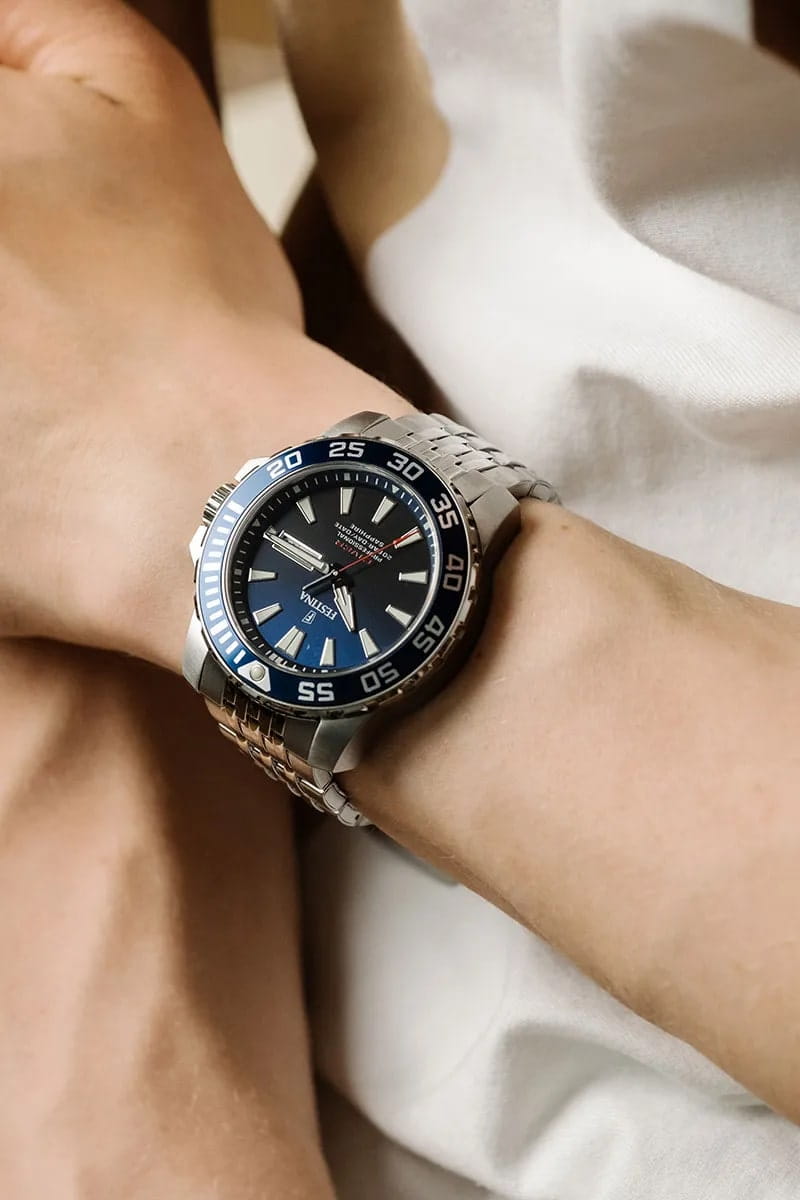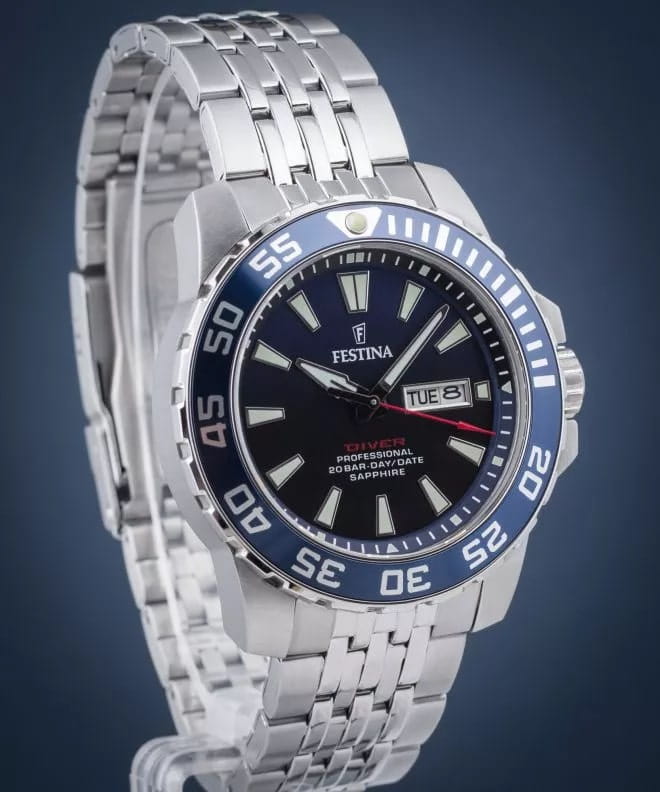 Мужские часы Festina The originals F20661/1, кварцевый механизм с высокой точностью. Сапфировое стеклоСапфировое стеклоПрочный и надёжный материал из кристалла сапфира синтетического происхождения, характеризующийся особой твёрдостью и устойчивостью к царапинам и повреждениям. устойчивое к появлению царапин, обладающее высокой прозрачностью. Класс водозащиты: 200 метров, позволит плавать, нырять и заниматься другими водными видами спорта. Корпус часов изготовлен из нержавеющей стали. Стальной браслет на раскладной застёжкеРаскладная застёжкаТакой тип застёжки используется только на браслетах из металла. Она никогда не раскрывается полностью, происходит разделение на 2 и более частей. Раскладывающая застёжка снизит вероятность потери часов к минимуму.. Окошки дня недели и даты находятся в положении 3 часа. Вращающийся стальной безельБезельВнешний ободок, закрепляющий стекло. В спортивных часах так называется поворотное кольцо с делениями на циферблате, выполняет роль таймера – замеряет отрезки времени на шкале. Неподвижный безель – элемент декора. Однонаправленно вращающийся безель на дайверских часах позволяет фиксировать моменты погружения и выныривания на поверхность. с IP-покрытиемIP-покрытиеМетод ионного напыления. Демонстрирует повышенную устойчивость к истиранию, окислению и химическим веществам. Под воздействием высокого давления и температуры около 1500°C молекулы металла надёжно соединяются с частицами корпуса часов.. Стрелки и метки с люминесцентным покрытиемЛюминесцентное покрытиеПозволяет считывать показания времени в темноте. Производители наносят на стрелки, часовые индексы, безель или поверхность циферблата светонакопительный состав, дающий холодное свечение..
