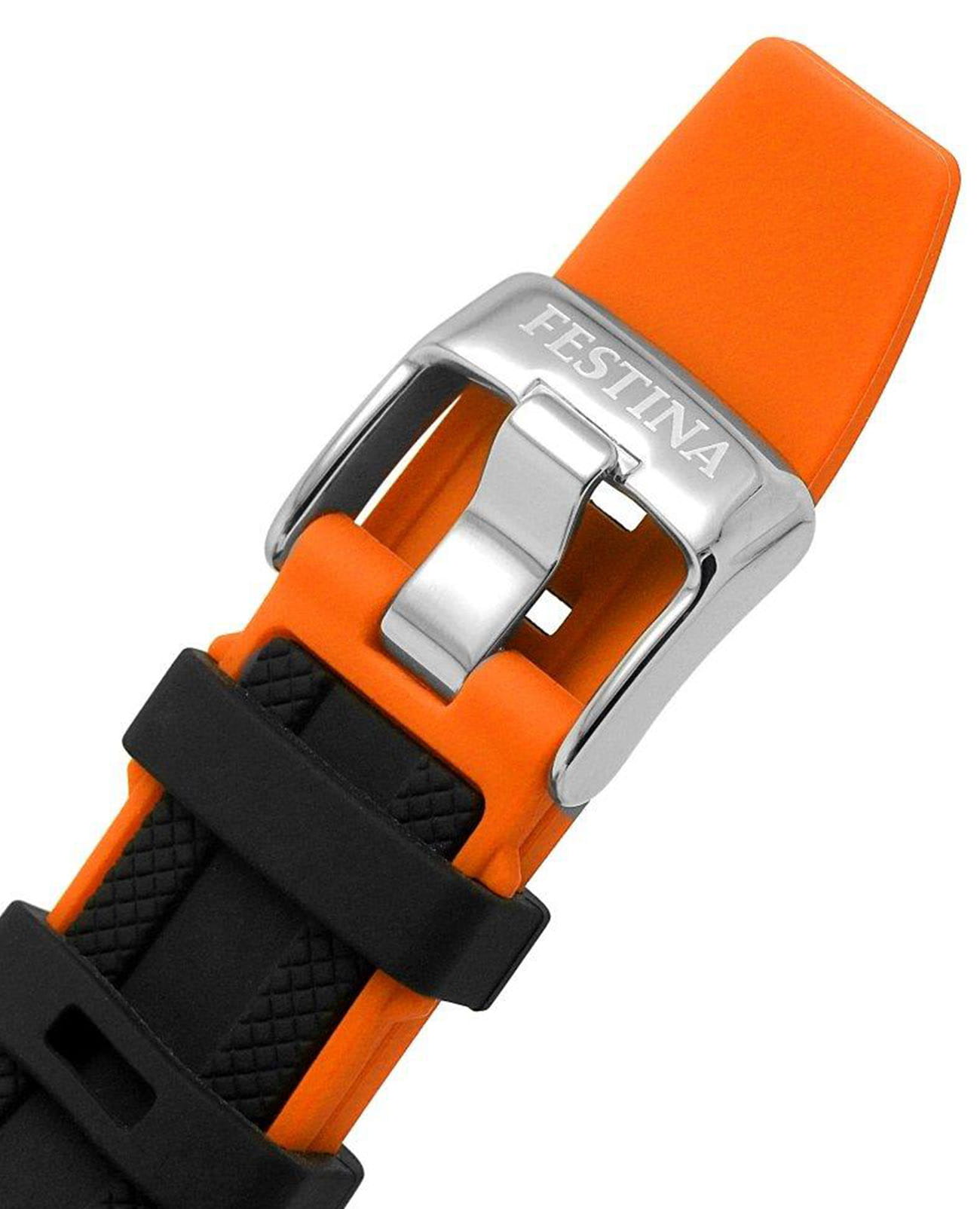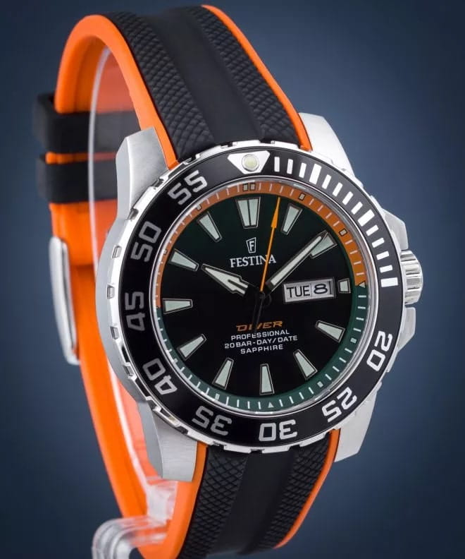 Мужские часы Festina The originals F20662/2, кварцевый механизм с высокой точностью. Сапфировое стеклоСапфировое стеклоПрочный и надёжный материал из кристалла сапфира синтетического происхождения, характеризующийся особой твёрдостью и устойчивостью к царапинам и повреждениям. устойчивое к появлению царапин, обладающее высокой прозрачностью. Класс водозащиты: 200 метров, позволит плавать, нырять и заниматься другими водными видами спорта. Корпус часов изготовлен из нержавеющей стали. Каучуковый ремешок с красной подкладкой на стандартной застёжке. Окошки дня недели и даты находятся в положении 3 часа. Вращающийся стальной безельБезельВнешний ободок, закрепляющий стекло. В спортивных часах так называется поворотное кольцо с делениями на циферблате, выполняет роль таймера – замеряет отрезки времени на шкале. Неподвижный безель – элемент декора. Однонаправленно вращающийся безель на дайверских часах позволяет фиксировать моменты погружения и выныривания на поверхность. с IP-покрытиемIP-покрытиеМетод ионного напыления. Демонстрирует повышенную устойчивость к истиранию, окислению и химическим веществам. Под воздействием высокого давления и температуры около 1500°C молекулы металла надёжно соединяются с частицами корпуса часов.. Стрелки и метки с люминесцентным покрытиемЛюминесцентное покрытиеПозволяет считывать показания времени в темноте. Производители наносят на стрелки, часовые индексы, безель или поверхность циферблата светонакопительный состав, дающий холодное свечение..