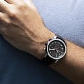Кварцевый механизм с высокой точностью c хронографомХронографФункция позволяет измерять отрезки времени с особой точностью: часы, минуты, секунды. Верным признаком хронографа является наличие на циферблате 3 дополнительных окошек-счётчиков.. Минеральное стеклоМинеральное стеклоМинеральное стекло представляет собой искусственно выращенный минерал кварца. Такое стекло отличается особой устойчивостью к повреждениям и царапинам. Уступает по некоторым качествам сапфировому стеклу. устойчивое к появлению царапин, обладающее высокой прозрачностью. Класс водозащиты: 100 метров, позволит плавать, нырять и заниматься другими водными видами спорта. Корпус часов изготовлен из нержавеющей стали. Кожаный ремешок на стандартной застежке. БезельБезельВнешний ободок, закрепляющий стекло. В спортивных часах так называется поворотное кольцо с делениями на циферблате, выполняет роль таймера – замеряет отрезки времени на шкале. Неподвижный безель – элемент декора. Однонаправленно вращающийся безель на дайверских часах позволяет фиксировать моменты погружения и выныривания на поверхность. с PVD-покрытиемPVDУльтратонкое покрытие наносится в технике вакуумного напыления, сочетает в себе нитрид титана особой прочности со слоем золота или оксида хрома. Несёт в себе декоративную или защитную функцию.. Стрелки и метки с люминесцентным покрытиемЛюминесцентное покрытиеПозволяет считывать показания времени в темноте. Производители наносят на стрелки, часовые индексы, безель или поверхность циферблата светонакопительный состав, дающий холодное свечение..