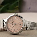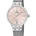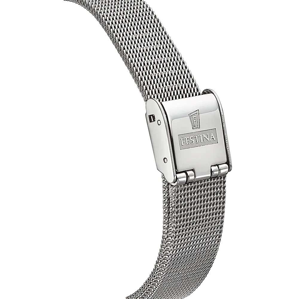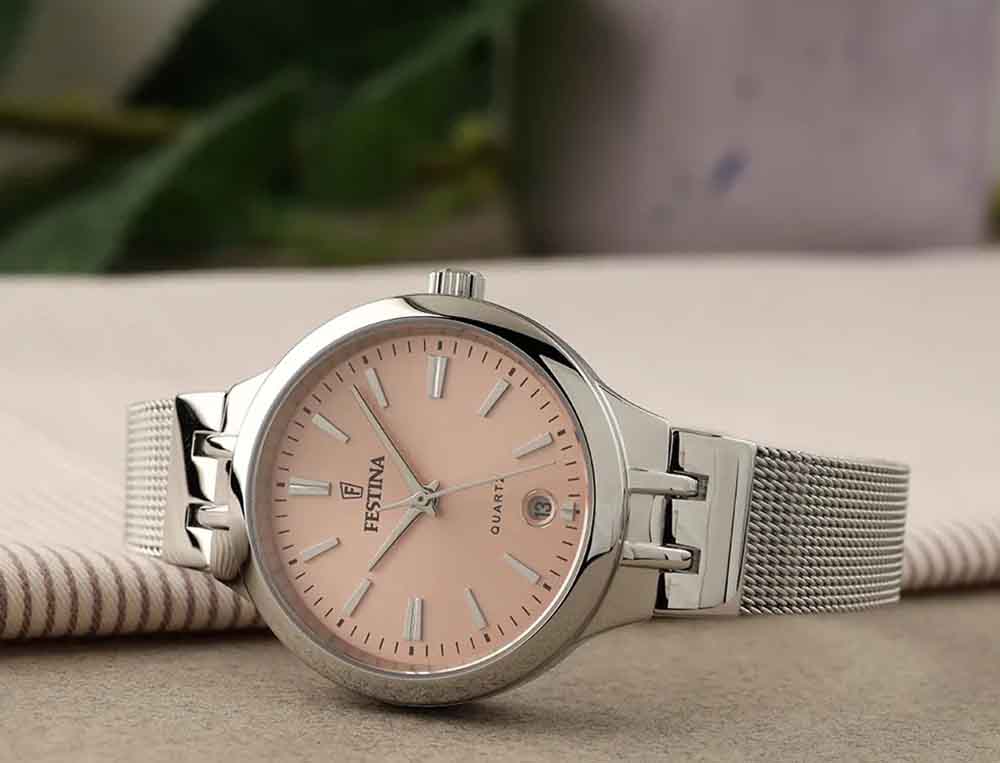 Часы Festina Mademoiselle F20712/3 для женщин представляют собой гармоничное сочетание современного стиля и функциональности. Эти часы имеют корпус из нержавеющей стали серебристого цвета шириной 33 мм, который придает изделию элегантный и утонченный вид. Розовый циферблат защищен сапфировым стекломСапфировое стеклоПрочный и надёжный материал из кристалла сапфира синтетического происхождения, характеризующийся особой твёрдостью и устойчивостью к царапинам и повреждениям., что гарантирует устойчивость к царапинам и долговечность. Функция отображения даты, расположенная на отметке «6 часов», добавляет практичности и удобства в использовании. Водонепроницаемость на глубине до 50 метров обеспечивает защиту от незначительных брызг, делая эти часы надежными в повседневном использовании. Браслет из нержавеющей стали в миланском плетении с раскладным замкомРаскладной замокДанный вариант застежки используется только на часах с металлическим браслетом. Отличительная особенность такого крепления в том, что длина браслета становится универсальной и вы можете самостоятельно отрегулировать нужный вам размер – застежка просто двигается по браслету часов. также выполнен в серебристом цвете и прекрасно дополняет общий дизайн, создавая цельный и привлекательный образ.