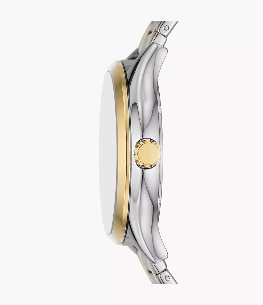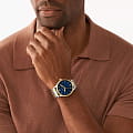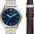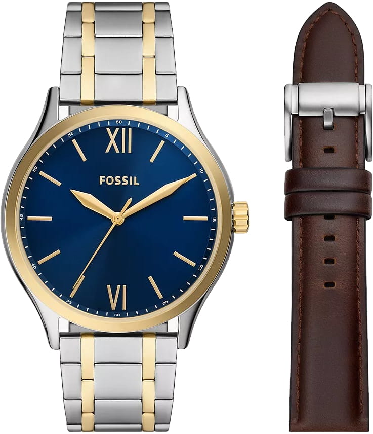 Часы Fossil Bannon BQ2786SET, кварцевый механизм с высокой точностью. Минеральное стеклоМинеральное стеклоМинеральное стекло представляет собой искусственно выращенный минерал кварца. Такое стекло отличается особой устойчивостью к повреждениям и царапинам. Уступает по некоторым качествам сапфировому стеклу. устойчивое к мелким механическим повреждениям. Класс водозащиты: 50 метров, позволит защитить корпус от случайных брызг или капель дождя. Корпус часов изготовлен из стали. Стрелки и метки с люминесцентным покрытиемЛюминесцентное покрытиеПозволяет считывать показания времени в темноте. Производители наносят на стрелки, часовые индексы, безель или поверхность циферблата светонакопительный состав, дающий холодное свечение.. Стальной браслет на раскладной застёжкеРаскладная застёжкаТакой тип застёжки используется только на браслетах из металла. Она никогда не раскрывается полностью, происходит разделение на 2 и более частей. Раскладывающая застёжка снизит вероятность потери часов к минимуму. с частичным IP-покрытиемIP-покрытиеМетод ионного напыления. Демонстрирует повышенную устойчивость к истиранию, окислению и химическим веществам. Под воздействием высокого давления и температуры около 1500°C молекулы металла надёжно соединяются с частицами корпуса часов.. В комплекте идет сменный силиконовый ремешок. БезельБезельВнешний ободок, закрепляющий стекло. В спортивных часах так называется поворотное кольцо с делениями на циферблате, выполняет роль таймера – замеряет отрезки времени на шкале. Неподвижный безель – элемент декора. Однонаправленно вращающийся безель на дайверских часах позволяет фиксировать моменты погружения и выныривания на поверхность. с IP-покрытиемIP-покрытиеМетод ионного напыления. Демонстрирует повышенную устойчивость к истиранию, окислению и химическим веществам. Под воздействием высокого давления и температуры около 1500°C молекулы металла надёжно соединяются с частицами корпуса часов..