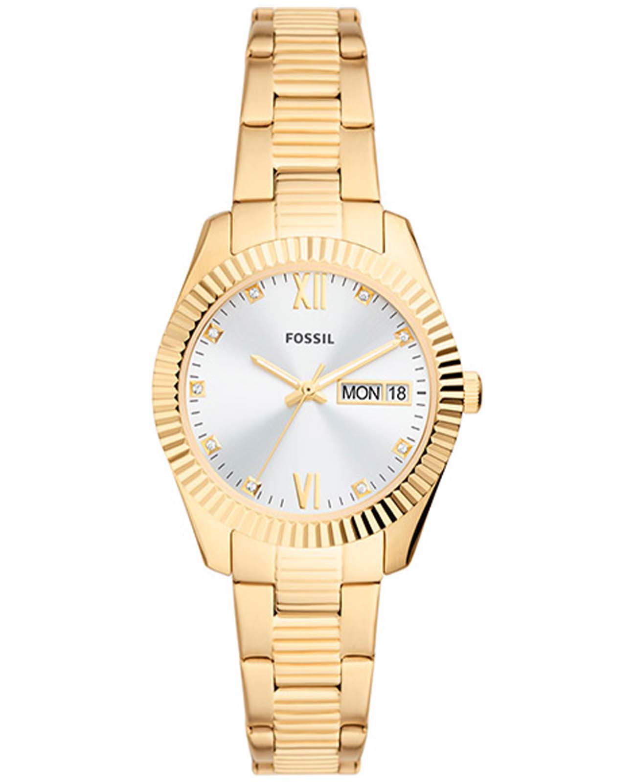 Женские американские кварцевые часы Fossil Scarlette ES5199, кварцевый механизм с высокой точностью. Класс водозащиты: 50 метров, позволит защитить корпус от случайных брызг или капель дождя. Корпус часов изготовлен из стали с IP-покрытиемIP-покрытиеМетод ионного напыления. Демонстрирует повышенную устойчивость к истиранию, окислению и химическим веществам. Под воздействием высокого давления и температуры около 1500°C молекулы металла надёжно соединяются с частицами корпуса часов.. Стальной браслет с раскладной застёжкойРаскладная застёжкаТакой тип застёжки используется только на браслетах из металла. Она никогда не раскрывается полностью, происходит разделение на 2 и более частей. Раскладывающая застёжка снизит вероятность потери часов к минимуму. с IP-покрытиемIP-покрытиеМетод ионного напыления. Демонстрирует повышенную устойчивость к истиранию, окислению и химическим веществам. Под воздействием высокого давления и температуры около 1500°C молекулы металла надёжно соединяются с частицами корпуса часов.. Окошки дня недели и даты находятся в положении 3 часа. Циферблат инкрустирован кристаллами. Стрелки с люминесцентным покрытиемЛюминесцентное покрытиеПозволяет считывать показания времени в темноте. Производители наносят на стрелки, часовые индексы, безель или поверхность циферблата светонакопительный состав, дающий холодное свечение..