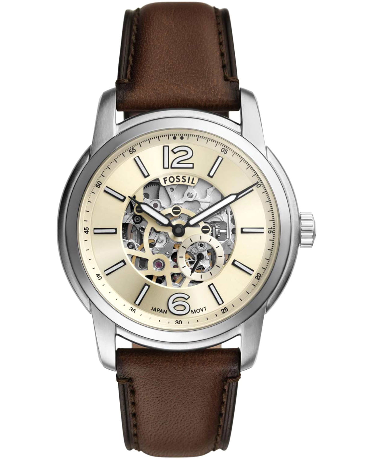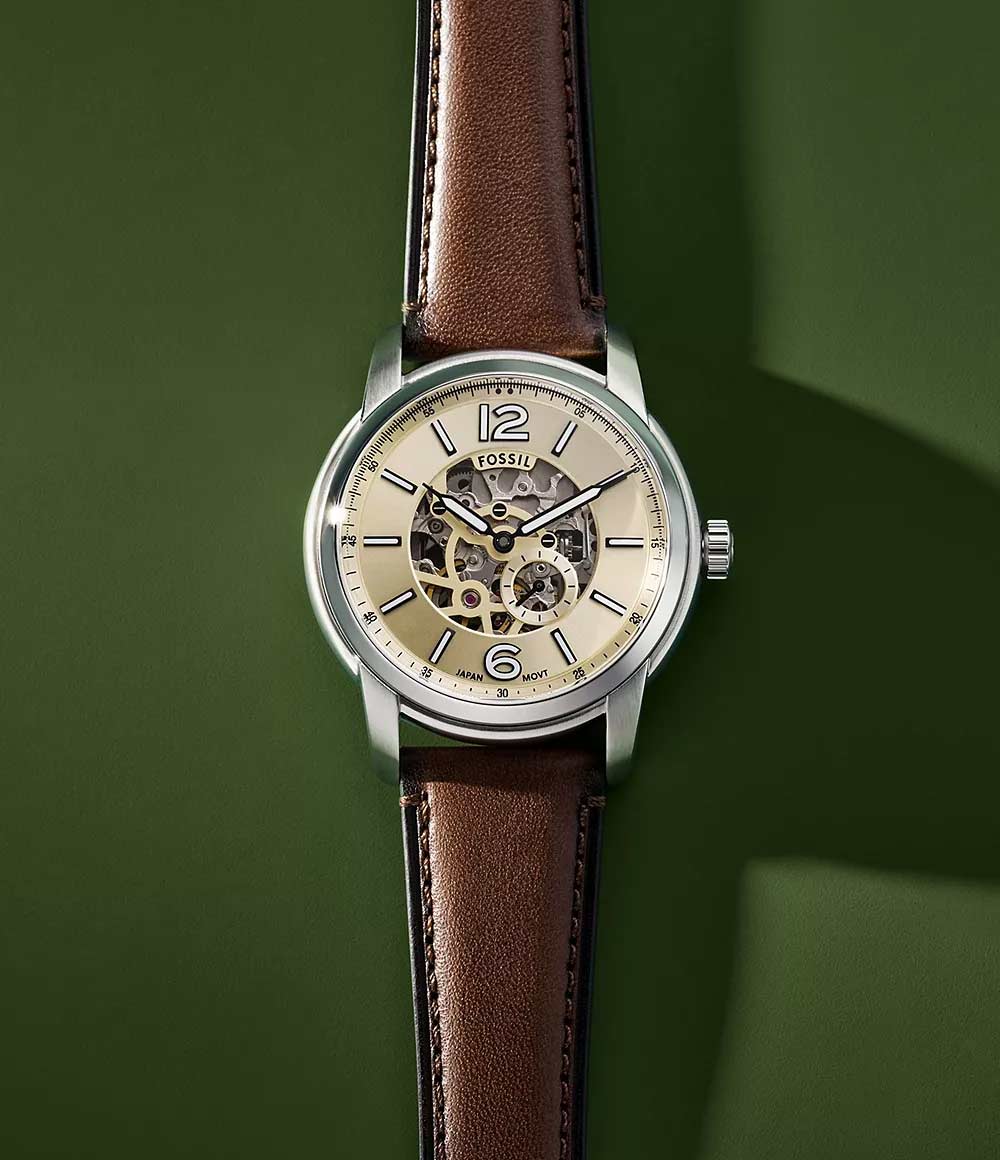 Скелетонизированные наручные часы Fossil Heritage ME3264 идеально подойдут для тех, кто ценит классический стиль, дополненный современными деталями, и ищет аксессуар, способный подчеркнуть их индивидуальность и элегантность. Мужские механические с автоподзаводом часы производятся в США. Корпус из нержавеющей стали диаметром 43 мм гарантирует долговечность и придает часам стильный и современный вид. Метки в виде штрихов и арабских цифр 6 и 12 придают циферблату классический акцент, а рифленая заводная головка облегчает настройку времени. Стрелки и метки с люминесцентным покрытиемЛюминесцентное покрытиеПозволяет считывать показания времени в темноте. Производители наносят на стрелки, часовые индексы, безель или поверхность циферблата светонакопительный состав, дающий холодное свечение. позволяют легко считывать время даже в условиях низкой освещенности. Кожаный ремешок на стандартной застёжке обеспечивает комфортное ношение и надежную фиксацию на запястье. Водозащита уровня 50WR защищает механизм от случайных брызг, а сапфировое стеклоСапфировое стеклоПрочный и надёжный материал из кристалла сапфира синтетического происхождения, характеризующийся особой твёрдостью и устойчивостью к царапинам и повреждениям. оберегает циферблат от царапин и повреждений. Прозрачная задняя крышка.