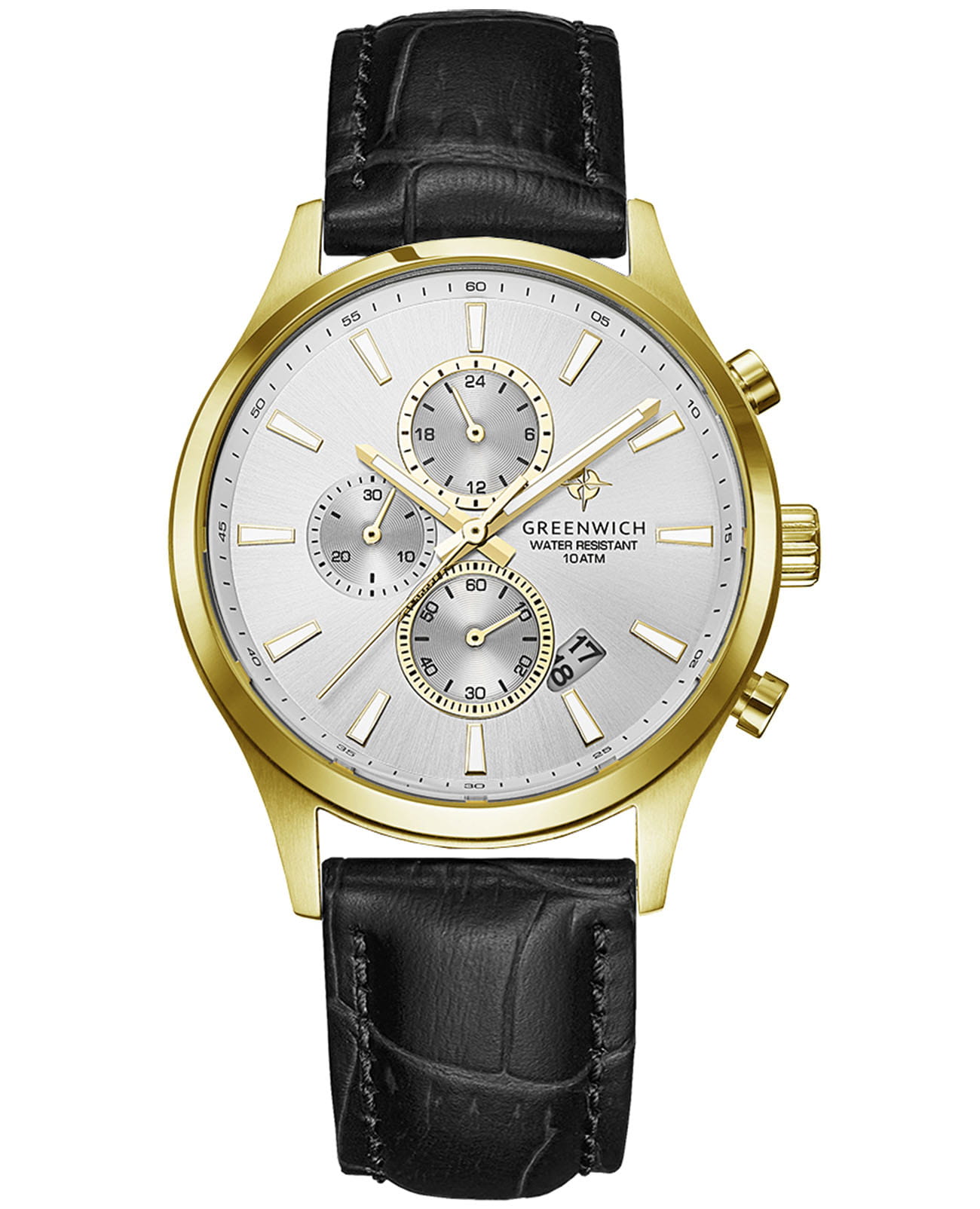 Мужские наручные часы-хронографХронографФункция позволяет измерять отрезки времени с особой точностью: часы, минуты, секунды. Верным признаком хронографа является наличие на циферблате 3 дополнительных окошек-счётчиков. Greenwich Navigator GW 053.21.33 представляют собой классический вариант для повседневной носки. Циферблат украшается брендовым логотипом, изображающим Розу Ветров. Эмблема мореплавательского духа символизирует удачу, стремление достигнуть поставленной цели. Часы характеризуются традиционными формами, лаконичным исполнением, что делает модель элегантным дополнением к деловому костюму. Надёжный корпус из нержавеющей стали с PVD-покрытиемPVDУльтратонкое покрытие наносится в технике вакуумного напыления, сочетает в себе нитрид титана особой прочности со слоем золота или оксида хрома. Несёт в себе декоративную или защитную функцию. спасает японский механизм от повреждений и ударов. Минеральное стеклоМинеральное стеклоМинеральное стекло представляет собой искусственно выращенный минерал кварца. Такое стекло отличается особой устойчивостью к повреждениям и царапинам. Уступает по некоторым качествам сапфировому стеклу. отличается устойчивостью к образованию царапин на поверхности. СекундомерСекундомерСекундоме́р — прибор, способный измерять интервалы времени с точностью до долей секунды.. Стрелки и метки с люминесцентным покрытиемЛюминесцентное покрытиеПозволяет считывать показания времени в темноте. Производители наносят на стрелки, часовые индексы, безель или поверхность циферблата светонакопительный состав, дающий холодное свечение.. Кожаный ремешок на стандартной застёжке. Окошко даты находится в положении между 4 и 5 часов. Класс водозащиты: 100 метров, позволит плавать, нырять и заниматься другими водными видами спорта.