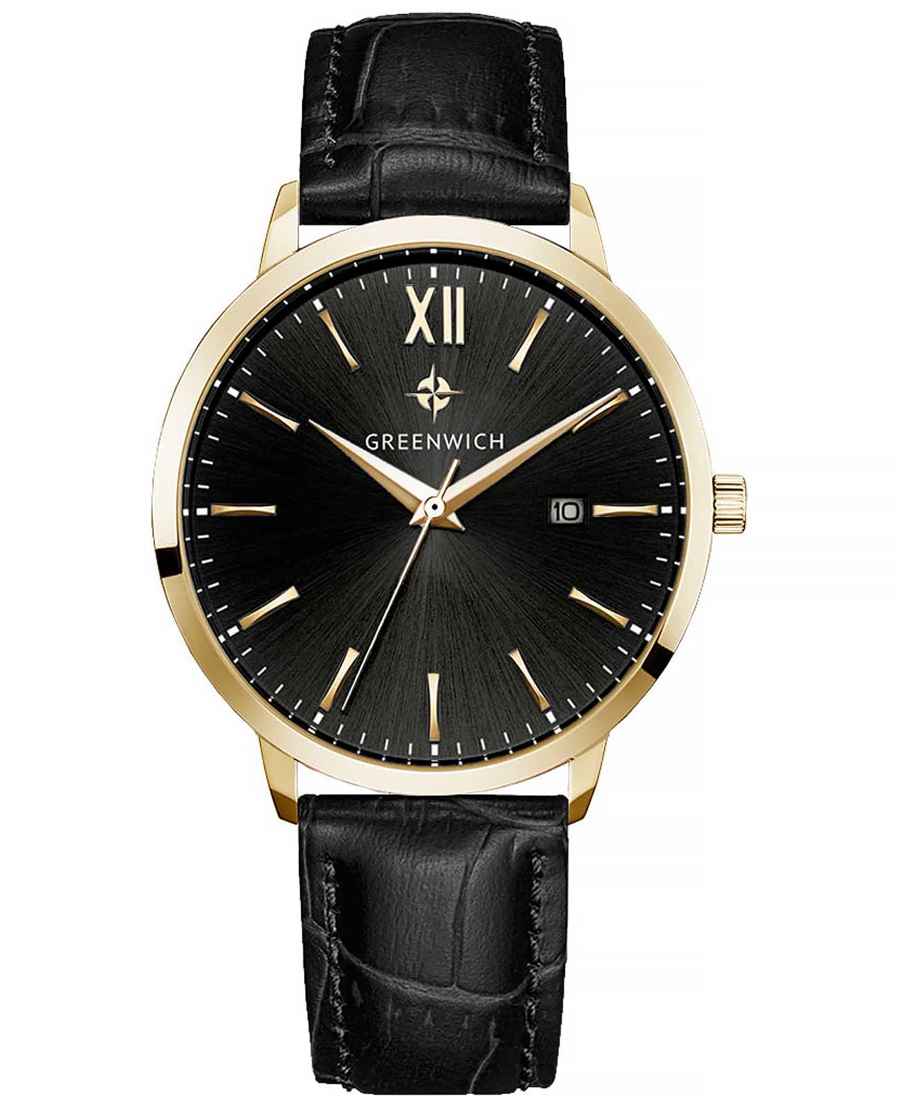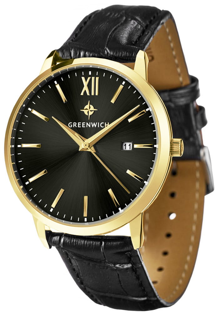 Мужские английские часы Greenwich GW 061.20.11 с минеральным стекломМинеральное стеклоМинеральное стекло представляет собой искусственно выращенный минерал кварца. Такое стекло отличается особой устойчивостью к повреждениям и царапинам. Уступает по некоторым качествам сапфировому стеклу.. Классические мужские часы серии Brig прекрасно подойдут как под костюм, так и под одежду направления casual. В часах установлен точный японский механизм Miyota. Корпус часов изготовлен из нержавеющей гипоаллергенной стали с PVDPVDУльтратонкое покрытие наносится в технике вакуумного напыления, сочетает в себе нитрид титана особой прочности со слоем золота или оксида хрома. Несёт в себе декоративную или защитную функцию. покрытием из желтого золота: он элегантно смотрится на руке и не создает неудобств при контакте с одеждой с длинным рукавом. Размер корпуса 41 мм. Полировка на циферблате черного цвета выполнена в виде солнечных лучей. Индексы часов изготовлены вручную и закреплены на двух штифтах. Выпуклая форма рисок создает эффект игры солнечных бликов. Объемные часовая и минутная стрелки имеют мечеобразную форму. В модели представлена дополнительная функция – дата. Ее окошко расположено на уровне трех часов. Циферблат надежно защищен минеральным стеклом. На часах установлен черный ремешок из натуральной кожи. Логотип марки – изображение «розы ветров», символа удачи и новых открытий – расположен на циферблате, заводной головке и внутренней части ремешка. Задняя крышка часов украшена изображениями логотипа и корабля, который является символом марки Greenwich.