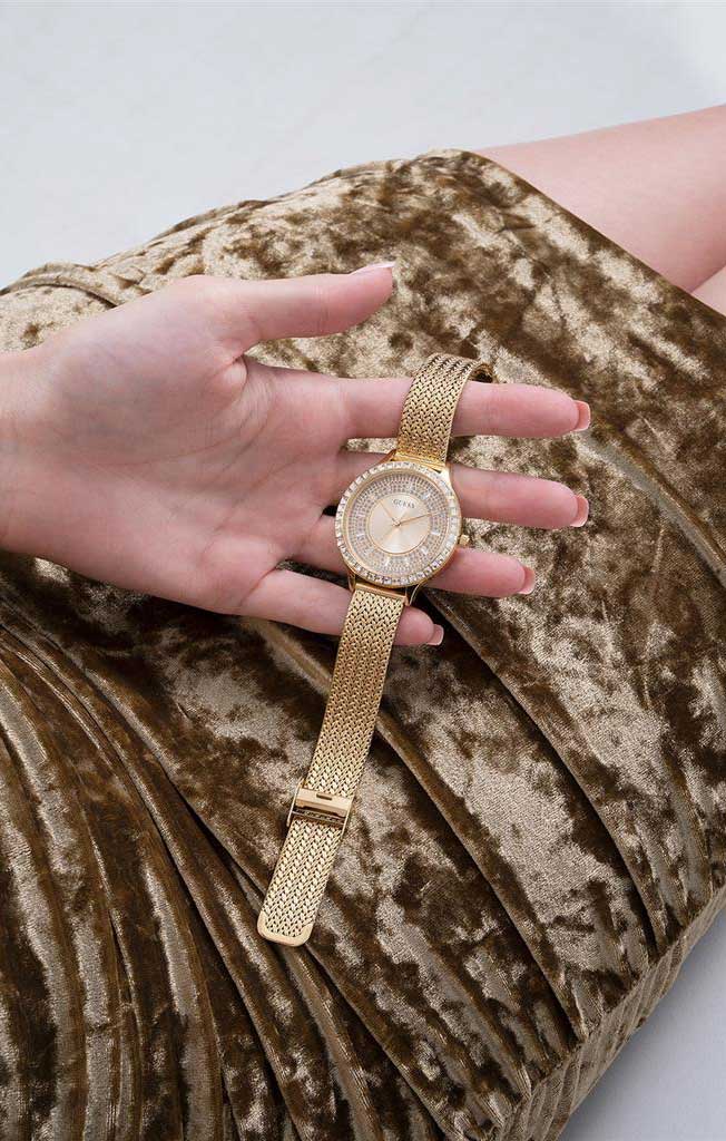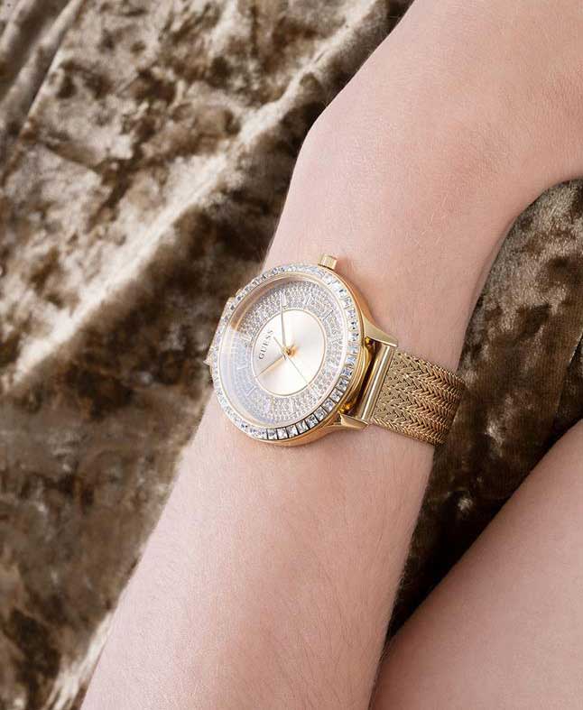 Женские наручные часы с кристаллами Guess Dress Steel GW0402L2, кварцевый механизм с высокой точностью. Класс водозащиты: 30 метров, позволит защитить корпус от случайных брызг или капель дождя. Корпус часов изготовлен из стали, золотистого цвета.