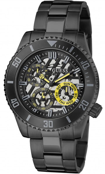 Мужские наручные часы с минеральным стекломМинеральное стеклоМинеральное стекло представляет собой искусственно выращенный минерал кварца. Такое стекло отличается особой устойчивостью к повреждениям и царапинам. Уступает по некоторым качествам сапфировому стеклу. Guess Axle GW0488G3, кварцевый механизм с высокой точностью. Класс водозащиты: 50 метров, позволит защитить корпус от случайных брызг или капель дождя. Корпус часов изготовлен из стали с IP-покрытиемIP-покрытиеМетод ионного напыления. Демонстрирует повышенную устойчивость к истиранию, окислению и химическим веществам. Под воздействием высокого давления и температуры около 1500°C молекулы металла надёжно соединяются с частицами корпуса часов.. Стальной браслет на раскладной застёжкеРаскладная застёжкаТакой тип застёжки используется только на браслетах из металла. Она никогда не раскрывается полностью, происходит разделение на 2 и более частей. Раскладывающая застёжка снизит вероятность потери часов к минимуму. с IP-покрытиемIP-покрытиеМетод ионного напыления. Демонстрирует повышенную устойчивость к истиранию, окислению и химическим веществам. Под воздействием высокого давления и температуры около 1500°C молекулы металла надёжно соединяются с частицами корпуса часов.. Стрелки с люминесцентным покрытиемЛюминесцентное покрытиеПозволяет считывать показания времени в темноте. Производители наносят на стрелки, часовые индексы, безель или поверхность циферблата светонакопительный состав, дающий холодное свечение.. 12-ти и 24-х часовой формат времени. Дата и день недели вынесены на отдельные циферблаты. Смещенная рифленая заводная головка с защитой.