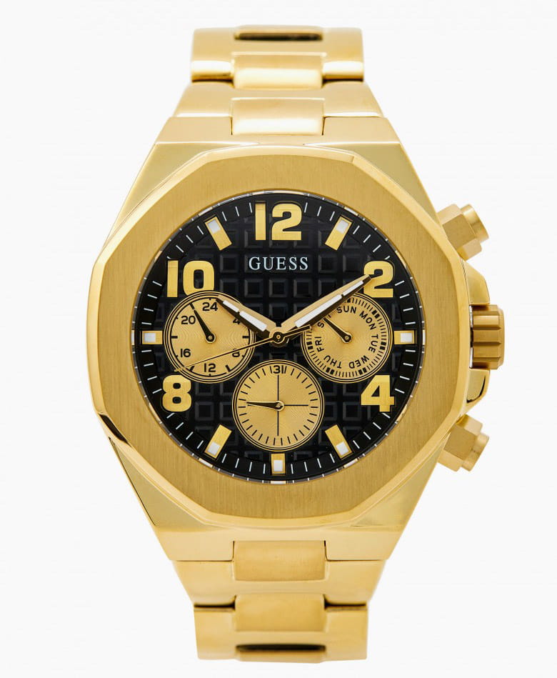 Мужские наручные часы с минеральным стекломМинеральное стеклоМинеральное стекло представляет собой искусственно выращенный минерал кварца. Такое стекло отличается особой устойчивостью к повреждениям и царапинам. Уступает по некоторым качествам сапфировому стеклу. Guess Empire GW0489G2, кварцевый механизм с высокой точностью. Класс водозащиты: 50 метров, позволит защитить корпус от случайных брызг или капель дождя. Корпус часов изготовлен из стали с IP-покрытиемIP-покрытиеМетод ионного напыления. Демонстрирует повышенную устойчивость к истиранию, окислению и химическим веществам. Под воздействием высокого давления и температуры около 1500°C молекулы металла надёжно соединяются с частицами корпуса часов.. Стальной браслет на раскладной застёжкеРаскладная застёжкаТакой тип застёжки используется только на браслетах из металла. Она никогда не раскрывается полностью, происходит разделение на 2 и более частей. Раскладывающая застёжка снизит вероятность потери часов к минимуму. с IP-покрытиемIP-покрытиеМетод ионного напыления. Демонстрирует повышенную устойчивость к истиранию, окислению и химическим веществам. Под воздействием высокого давления и температуры около 1500°C молекулы металла надёжно соединяются с частицами корпуса часов.. Стрелки с люминесцентным покрытиемЛюминесцентное покрытиеПозволяет считывать показания времени в темноте. Производители наносят на стрелки, часовые индексы, безель или поверхность циферблата светонакопительный состав, дающий холодное свечение.. 12-ти и 24-х часовой формат времени, дата и день недели вынесены на отдельные циферблаты. Метки в виде штрихов и арабских цифр. Рифленая заводная головка с защитой.