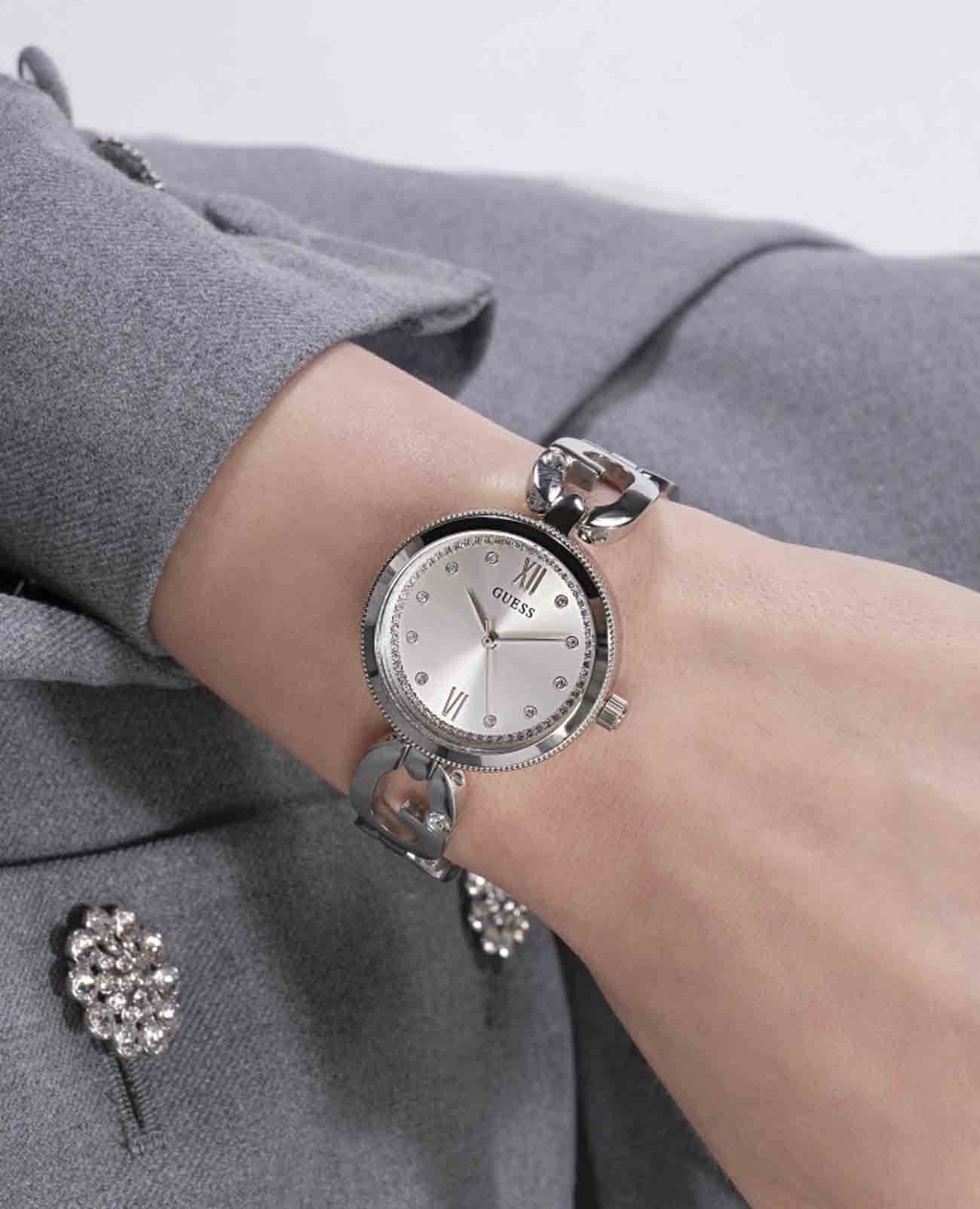 Женские наручные часы с минеральным стекломМинеральное стеклоМинеральное стекло представляет собой искусственно выращенный минерал кварца. Такое стекло отличается особой устойчивостью к повреждениям и царапинам. Уступает по некоторым качествам сапфировому стеклу. Guess Trend GW0759L1, кварцевый механизм с высокой точностью. Корпус часов изготовлен из стали. Циферблат и браслет частично украшены кристаллами. Класс водозащиты: 30 метров, позволит защитить корпус от случайных брызг или капель дождя. Стальной браслет на ювелирной застежке.