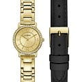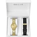 Женские наручные часы Guess Dress GW0808L2 с минеральным стекломМинеральное стеклоМинеральное стекло представляет собой искусственно выращенный минерал кварца. Такое стекло отличается особой устойчивостью к повреждениям и царапинам. Уступает по некоторым качествам сапфировому стеклу., кварцевый механизм с высокой точностью. Корпус часов изготовлен из стали с IP-покрытиемIP-покрытиеМетод ионного напыления. Демонстрирует повышенную устойчивость к истиранию, окислению и химическим веществам. Под воздействием высокого давления и температуры около 1500°C молекулы металла надёжно соединяются с частицами корпуса часов.. БезельБезельВнешний ободок, закрепляющий стекло. В спортивных часах так называется поворотное кольцо с делениями на циферблате, выполняет роль таймера – замеряет отрезки времени на шкале. Неподвижный безель – элемент декора. Однонаправленно вращающийся безель на дайверских часах позволяет фиксировать моменты погружения и выныривания на поверхность. с IP-покрытиемIP-покрытиеМетод ионного напыления. Демонстрирует повышенную устойчивость к истиранию, окислению и химическим веществам. Под воздействием высокого давления и температуры около 1500°C молекулы металла надёжно соединяются с частицами корпуса часов. украшен кристаллами. Класс водозащиты: 50 метров, позволит защитить корпус от случайных брызг или капель дождя. Стальной браслет с IP-покрытиемIP-покрытиеМетод ионного напыления. Демонстрирует повышенную устойчивость к истиранию, окислению и химическим веществам. Под воздействием высокого давления и температуры около 1500°C молекулы металла надёжно соединяются с частицами корпуса часов. на раскладной застёжкеРаскладная застёжкаТакой тип застёжки используется только на браслетах из металла. Она никогда не раскрывается полностью, происходит разделение на 2 и более частей. Раскладывающая застёжка снизит вероятность потери часов к минимуму.. Кожаный ремешок в комплекте.