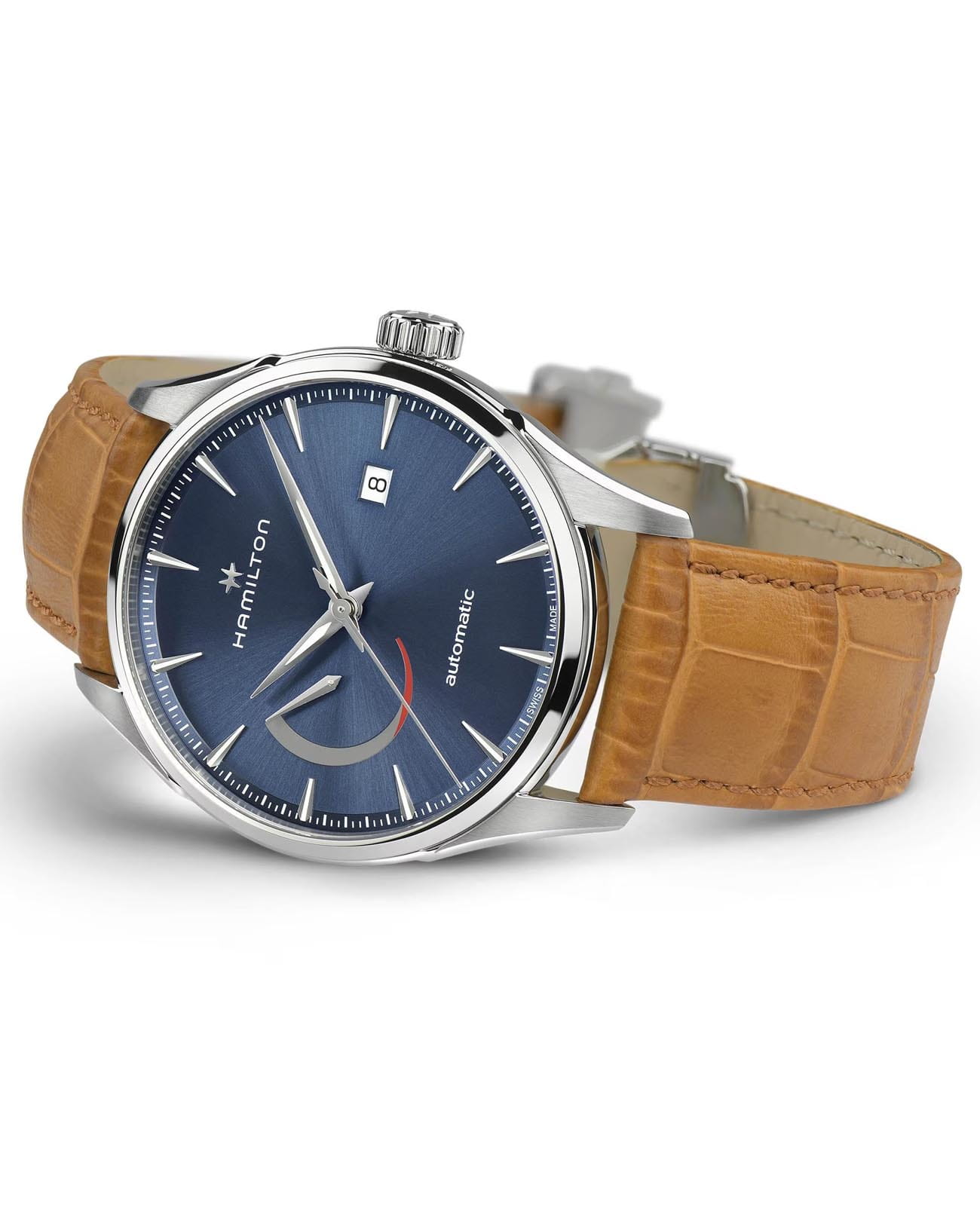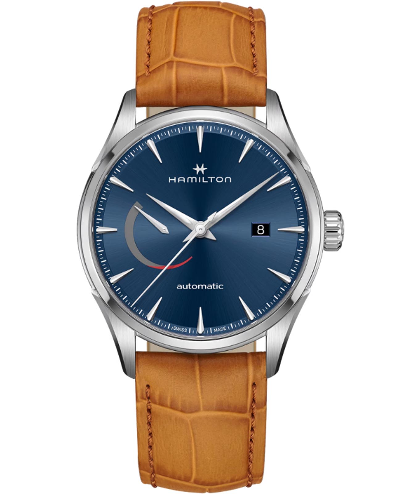 Мужские наручные часы Hamilton Jazzmaster Power Reserve Auto H32635541 с надежным автоматическим механизмом. Шкала индикатора запаса хода позволяет в полной мере оценить всю мощь автономно функционирующего в течение 80 часов механизма. Корпус часов изготовлен из нержавеющей стали. Кожаный ремешок с раскладной застёжкойРаскладная застёжкаТакой тип застёжки используется только на браслетах из металла. Она никогда не раскрывается полностью, происходит разделение на 2 и более частей. Раскладывающая застёжка снизит вероятность потери часов к минимуму.. Окошко даты находится в положении 3 часа. Класс водозащиты: 50 метров, позволит защитить корпус от случайных брызг или капель дождя. Сапфировое стеклоСапфировое стеклоПрочный и надёжный материал из кристалла сапфира синтетического происхождения, характеризующийся особой твёрдостью и устойчивостью к царапинам и повреждениям. устойчивое к мелким механическим повреждениям.  Стрелки и метки с люминесцентным покрытиемЛюминесцентное покрытиеПозволяет считывать показания времени в темноте. Производители наносят на стрелки, часовые индексы, безель или поверхность циферблата светонакопительный состав, дающий холодное свечение..