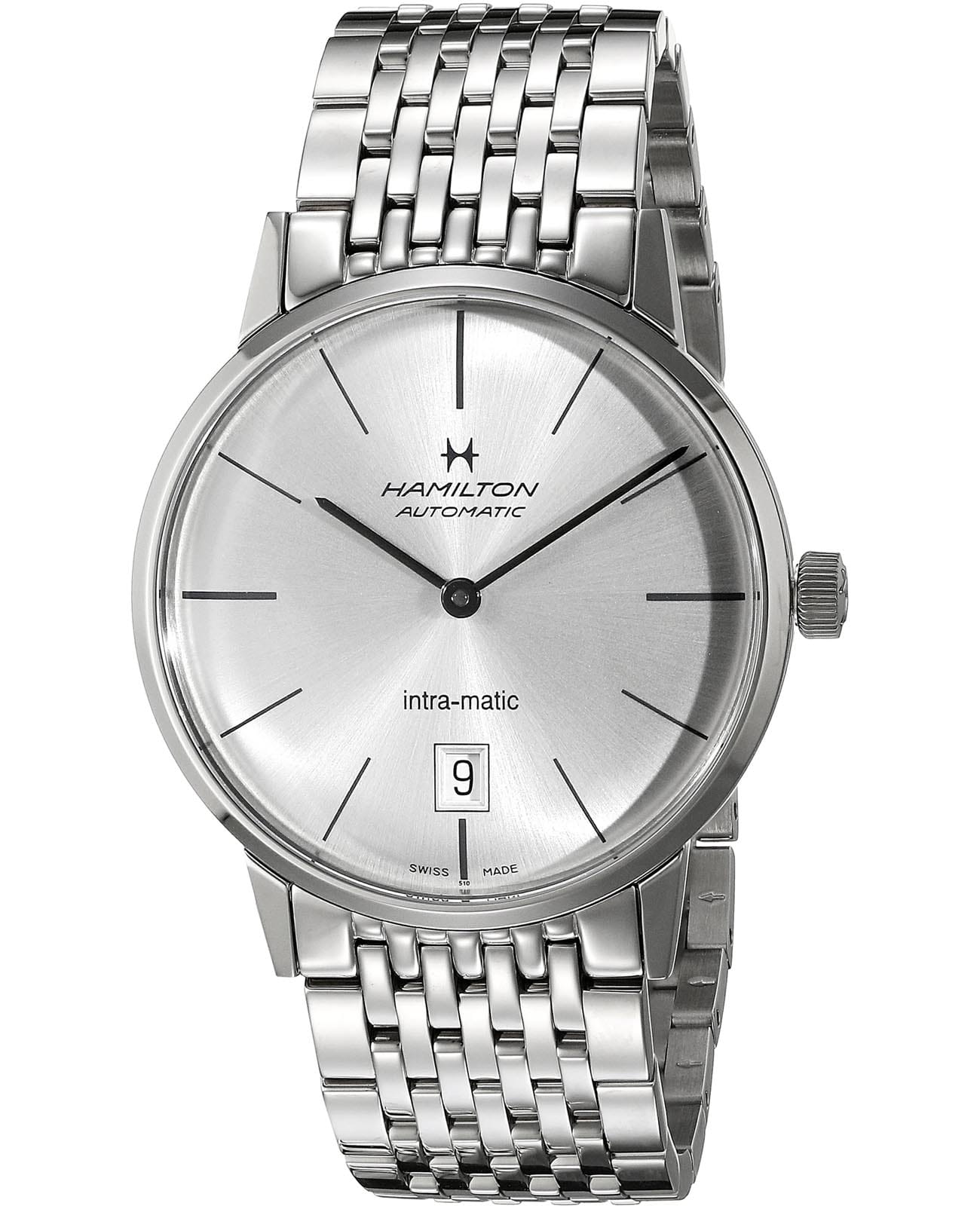 Мужские наручные часы Hamilton American Classic Intra-Matic Auto H38455151 с надёжным автоматическим механизмом. Корпус часов изготовлен из нержавеющей стали. Стальной браслет на застёжке-бабочке с кнопкамиЗастёжка "бабочка"Такой вид застёжки дополняется предохранителями, помогающими избежать случайного раскрытия браслета. Обладают изящным исполнением. . Сапфировое стеклоСапфировое стеклоПрочный и надёжный материал из кристалла сапфира синтетического происхождения, характеризующийся особой твёрдостью и устойчивостью к царапинам и повреждениям. с антибликовым покрытием. Окошко даты находится в положении 6 часов. Класс водозащиты: 50 метров, позволит защитить корпус от случайных брызг или капель дождя.