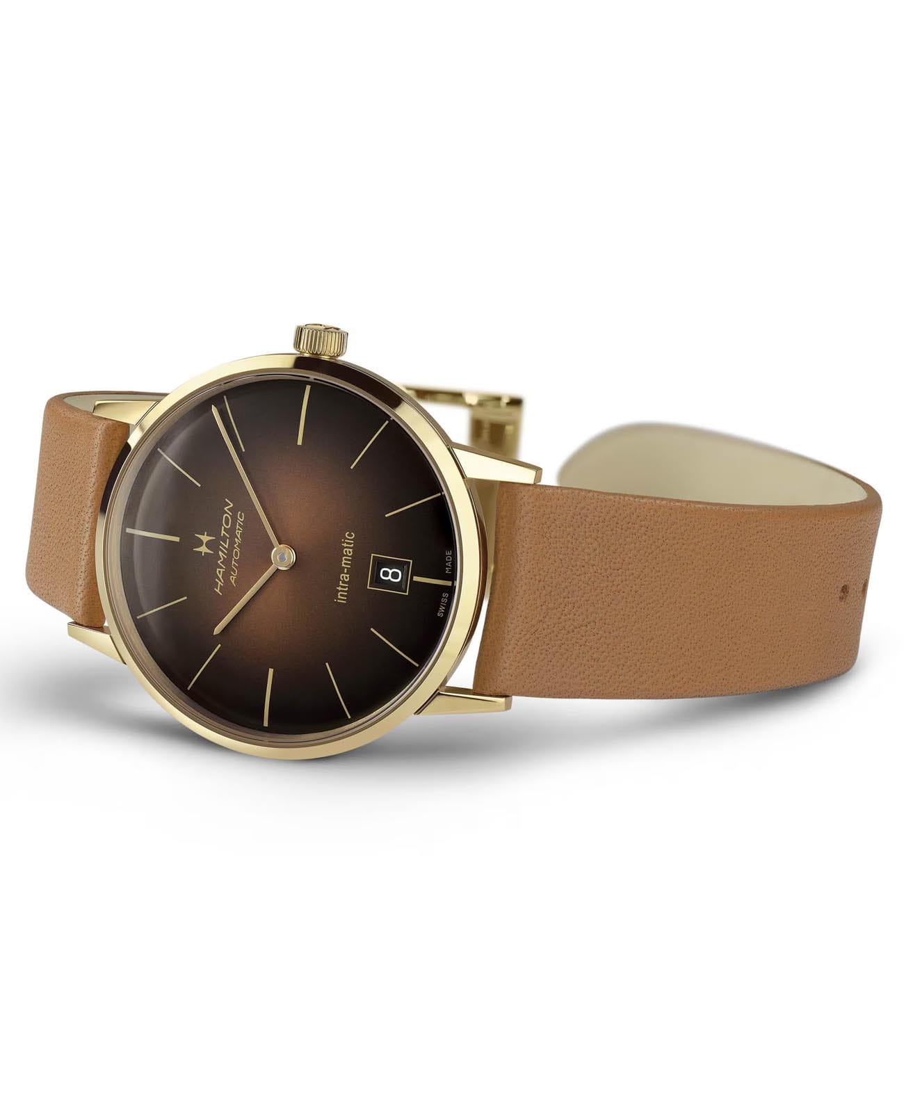 Мужские наручные часы Hamilton American Classic Intra-Matic Auto H38475501 с надёжным автоматическим механизмом. Корпус часов изготовлен из нержавеющей стали с золотым PVD-покрытиемPVDУльтратонкое покрытие наносится в технике вакуумного напыления, сочетает в себе нитрид титана особой прочности со слоем золота или оксида хрома. Несёт в себе декоративную или защитную функцию.. Практичный кожаный ремешок на стандартной застёжке. Сапфировое стеклоСапфировое стеклоПрочный и надёжный материал из кристалла сапфира синтетического происхождения, характеризующийся особой твёрдостью и устойчивостью к царапинам и повреждениям. с антибликовым покрытием. Окошко даты находится в положении 6 часов.