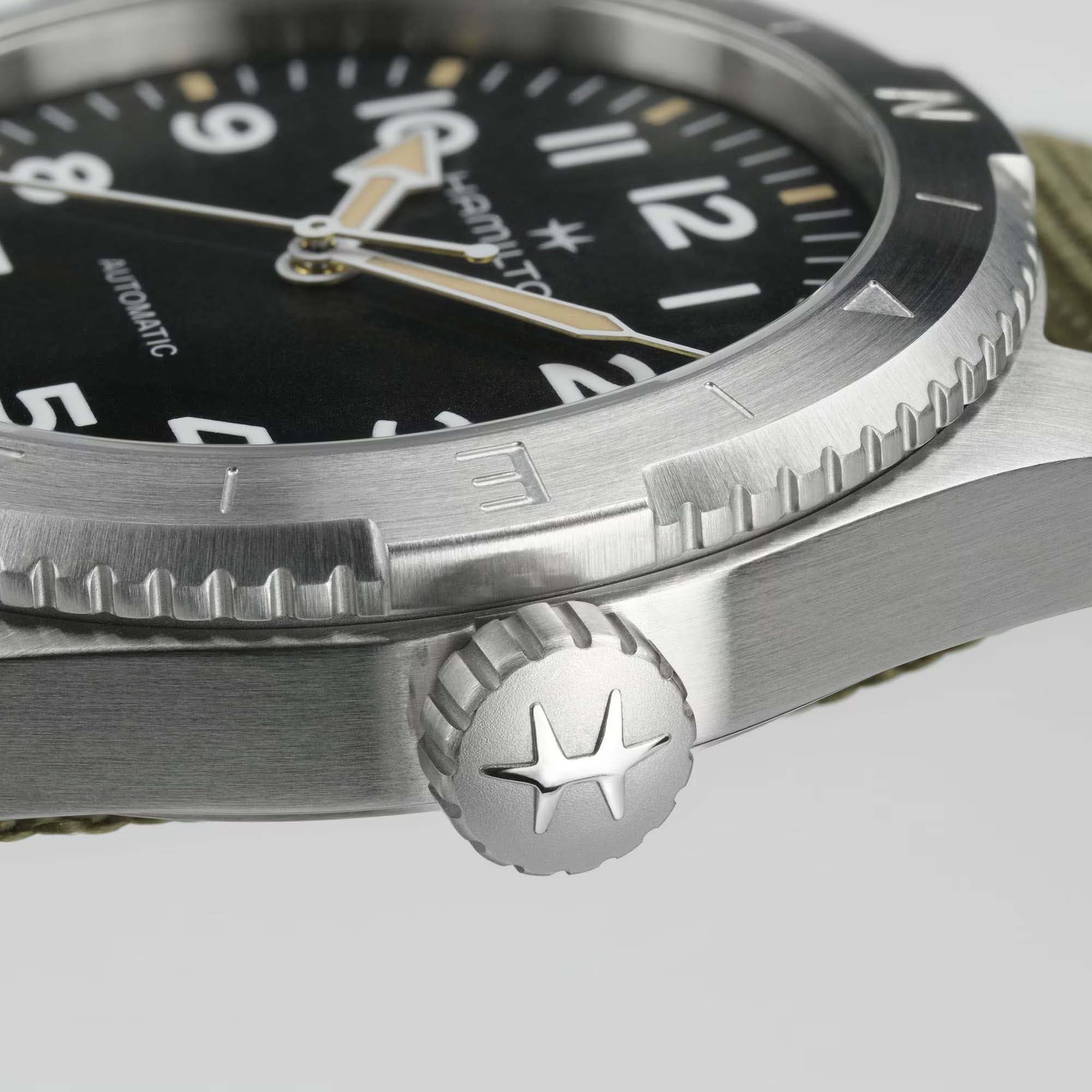 Мужские наручные часы Hamilton Khaki Field Expedition Auto H70315931 с автоматическим механизмом. Корпус часов изготовлен из нержавеющей стали. Сапфировое стеклоСапфировое стеклоПрочный и надёжный материал из кристалла сапфира синтетического происхождения, характеризующийся особой твёрдостью и устойчивостью к царапинам и повреждениям. с антибликовым покрытием. Стрелки и метки с люминесцентным покрытиемЛюминесцентное покрытиеПозволяет считывать показания времени в темноте. Производители наносят на стрелки, часовые индексы, безель или поверхность циферблата светонакопительный состав, дающий холодное свечение.. Уровень влагозащиты: 100 метров, позволит плавать, нырять и заниматься другими водными видами спорта. Невероятно прочные часы дополнены завинчивающейся заводной головкой и черным циферблатом с пескоструйной обработкой. Текстильный ремешок NATOРемешок NATOРемешок NATO — это прочный, универсальный и сменный часовой ремешок, изначально созданный для военных. Он изготовлен из нейлона или другого прочного материала и имеет уникальную конструкцию, которая позволяет часам оставаться на запястье даже в случае поломки одной из прикрепляющих точек. .