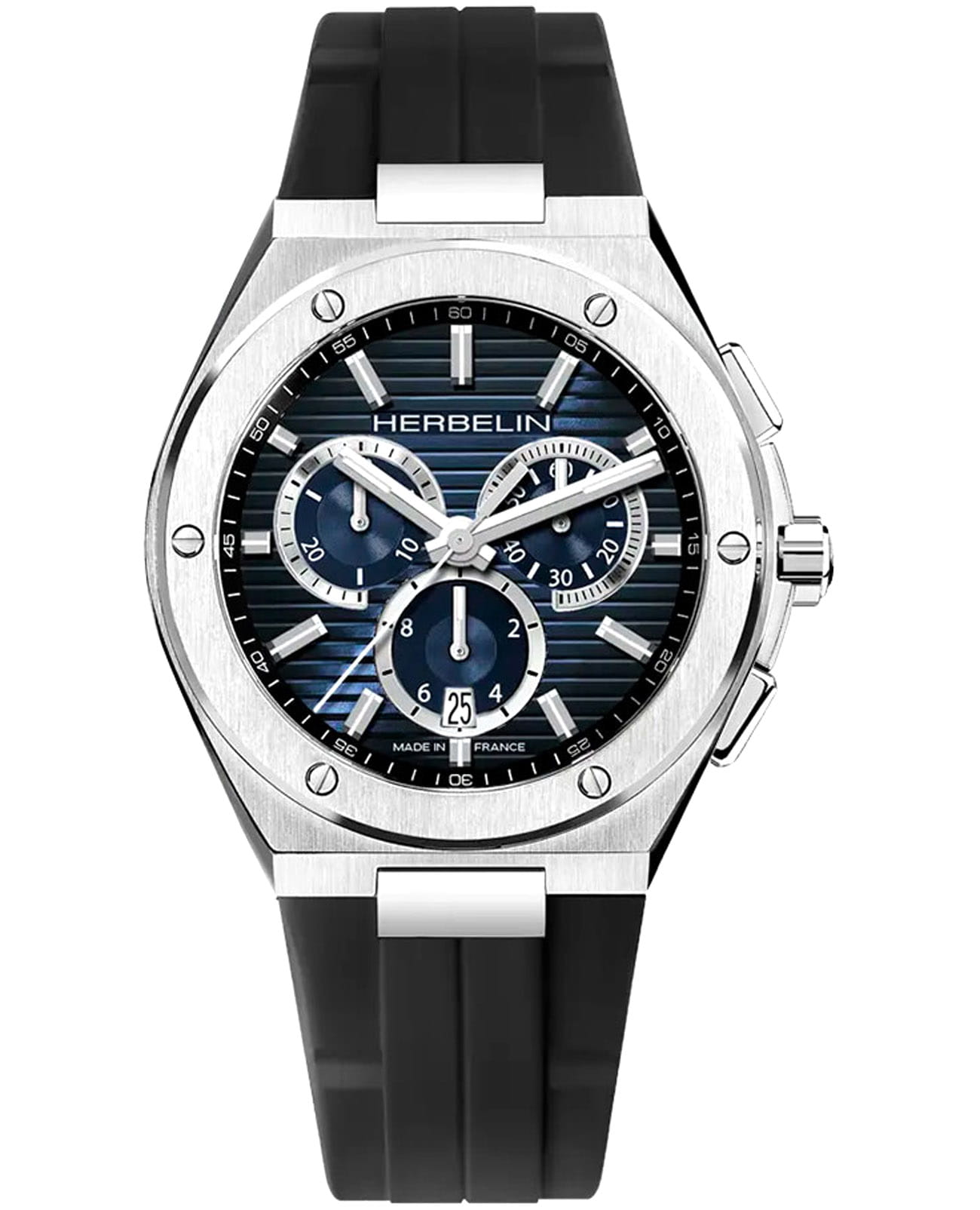 Мужские кварцевые наручные часы-хронографХронографФункция позволяет измерять отрезки времени с особой точностью: часы, минуты, секунды. Верным признаком хронографа является наличие на циферблате 3 дополнительных окошек-счётчиков. Herbelin Cap Camarat 37645A15CA – отражающий идеальное сочетание современного дизайна, надёжности и функциональности. Элегантный облик станет превосходным завершением образа, наделив его индивидуальным характером. Корпус из нержавеющей стали серебристого цвета, диаметром 42 мм, идеально сбалансирован и элегантен. Сапфировое стеклоСапфировое стеклоПрочный и надёжный материал из кристалла сапфира синтетического происхождения, характеризующийся особой твёрдостью и устойчивостью к царапинам и повреждениям. защищает циферблат от царапин и устойчивое к механическим повреждениям. БезельБезельВнешний ободок, закрепляющий стекло. В спортивных часах так называется поворотное кольцо с делениями на циферблате, выполняет роль таймера – замеряет отрезки времени на шкале. Неподвижный безель – элемент декора. Однонаправленно вращающийся безель на дайверских часах позволяет фиксировать моменты погружения и выныривания на поверхность. украшен винтами, заводная головка с защитой. Окошко даты находится в положении 6 часов. Стрелки и метки с люминесцентным покрытиемЛюминесцентное покрытиеПозволяет считывать показания времени в темноте. Производители наносят на стрелки, часовые индексы, безель или поверхность циферблата светонакопительный состав, дающий холодное свечение.. Каучуковый ремешок на стандартной застежке обеспечивает комфортное ношение. Водозащита 100 метров позволит плавать, нырять и заниматься другими водными видами спорта. Эта модель – отличный выбор для тех, кто ищет сочетание стиля, качества и функциональности. Часы станут не только полезным аксессуаром, но и выразительным элементом вашего имиджа.