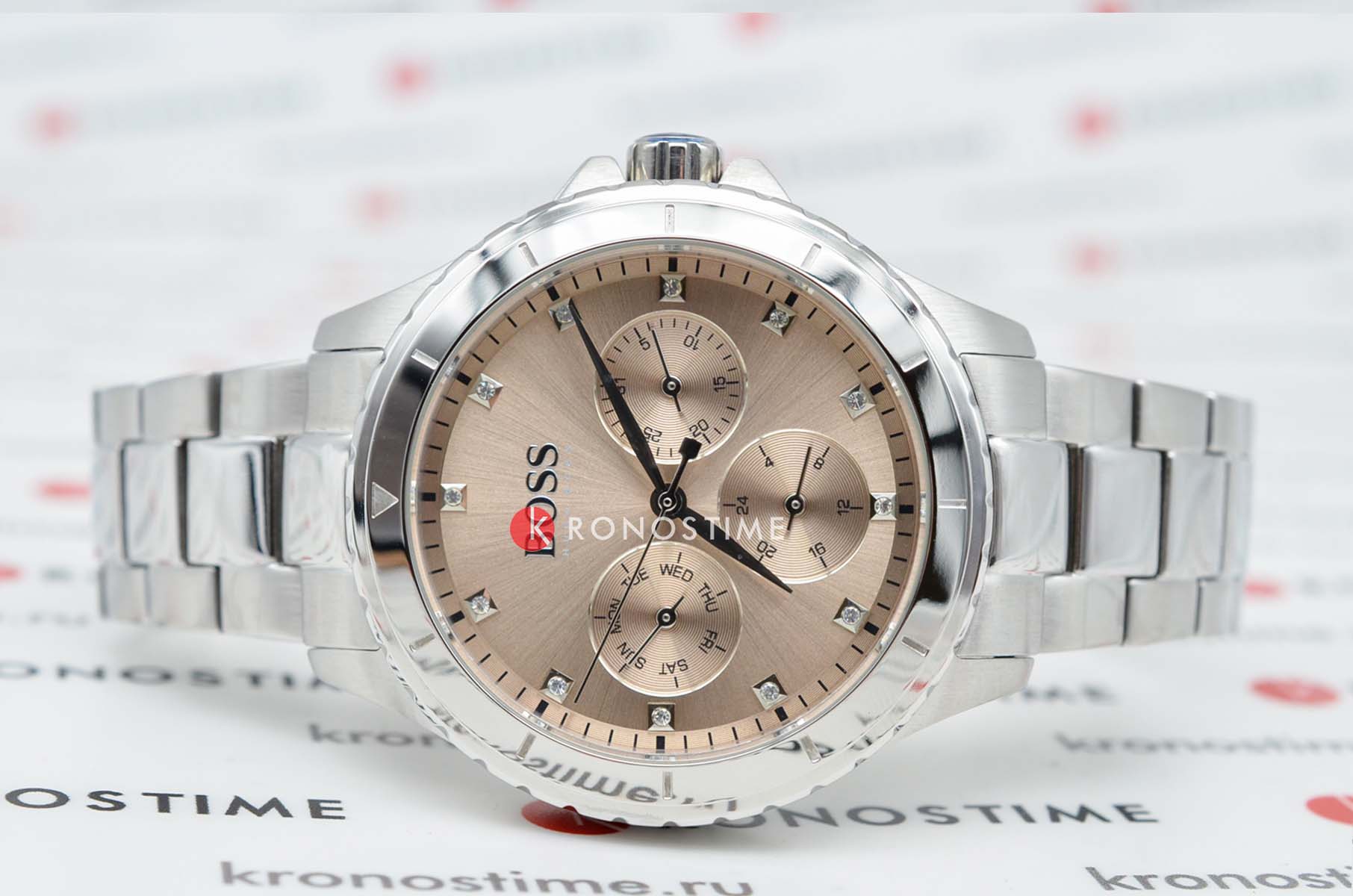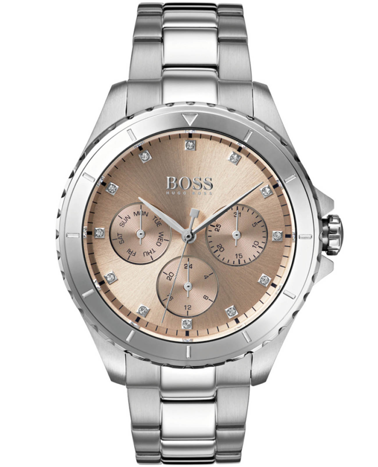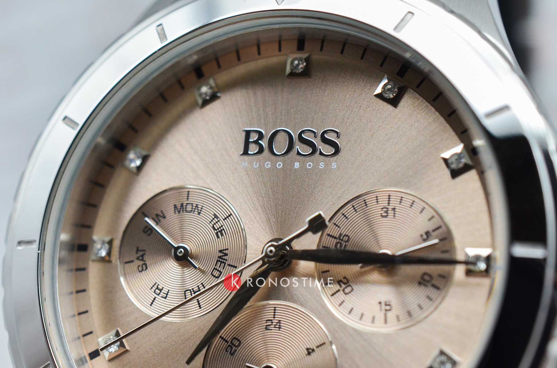 Элегантные женские часы Hugo Boss Premiere HB1502444 из коллекции представлены в стальном корпусе диаметром 38 мм с эффектным розовым циферблатом, защищённым прочным минеральным стекломМинеральное стеклоМинеральное стекло представляет собой искусственно выращенный минерал кварца. Такое стекло отличается особой устойчивостью к повреждениям и царапинам. Уступает по некоторым качествам сапфировому стеклу.. Модель оснащена швейцарским кварцевым механизмом с полезными функциями: день недели, дата, второй часовой поясВторой часовой поясФункция, позволяющая отображать время двух часовых поясов одновременно. в 24-часовом формате. Спортивный характер подчёркивает поворотный безельБезельВнешний ободок, закрепляющий стекло. В спортивных часах так называется поворотное кольцо с делениями на циферблате, выполняет роль таймера – замеряет отрезки времени на шкале. Неподвижный безель – элемент декора. Однонаправленно вращающийся безель на дайверских часах позволяет фиксировать моменты погружения и выныривания на поверхность. из стали, а стальной браслет с раскладной застежкойРаскладная застёжкаТакой тип застёжки используется только на браслетах из металла. Она никогда не раскрывается полностью, происходит разделение на 2 и более частей. Раскладывающая застёжка снизит вероятность потери часов к минимуму. гарантирует комфортное ношение и надежную фиксацию.Эта элегантная модель с 12 кристаллами Swarovski с водонепроницаемостью 50 метров делает часы устойчивыми к повседневным нагрузкам. Эти часы сочетают в себе превосходное качество и изысканность. Они станут отличным выбором для тех, кто ценит стильный дизайн и функциональность в одном аксессуаре, подходят для ежедневного использования.