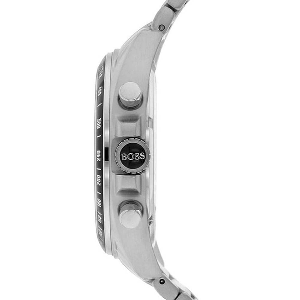 Мужские кварцевые часы Hugo Boss HB1513081 представляют собой стильный хронографХронографФункция позволяет измерять отрезки времени с особой точностью: часы, минуты, секунды. Верным признаком хронографа является наличие на циферблате 3 дополнительных окошек-счётчиков. с корпусом диаметром 45 мм из нержавеющей стали, дополненным синим циферблатом с серебристыми стрелками и индексами для оптимальной читаемости. Модель оснащена высокоточным кварцевым механизмом с функцией хронографаХронографФункция позволяет измерять отрезки времени с особой точностью: часы, минуты, секунды. Верным признаком хронографа является наличие на циферблате 3 дополнительных окошек-счётчиков., включая 60-минутный счетчик и 24-часовой индикатор, а также тахиметрической шкалой на неподвижном безелеБезельВнешний ободок, закрепляющий стекло. В спортивных часах так называется поворотное кольцо с делениями на циферблате, выполняет роль таймера – замеряет отрезки времени на шкале. Неподвижный безель – элемент декора. Однонаправленно вращающийся безель на дайверских часах позволяет фиксировать моменты погружения и выныривания на поверхность. с IP-покрытиемIP-покрытиеМетод ионного напыления. Демонстрирует повышенную устойчивость к истиранию, окислению и химическим веществам. Под воздействием высокого давления и температуры около 1500°C молекулы металла надёжно соединяются с частицами корпуса часов. для расчетов скорости. Циферблат защищен устойчивым к царапинам минеральным стекломМинеральное стеклоМинеральное стекло представляет собой искусственно выращенный минерал кварца. Такое стекло отличается особой устойчивостью к повреждениям и царапинам. Уступает по некоторым качествам сапфировому стеклу., а водонепроницаемость 5 ATM (50 метров) обеспечивает защиту от брызг и дождя, делая часы практичными для повседневного использования. Стальной браслет с застёжкой «бабочка»Застёжка "бабочка"Такой вид застёжки дополняется предохранителями, помогающими избежать случайного раскрытия браслета. Обладают изящным исполнением. обеспечивает надежную и комфортную посадку на запястье, подчеркивая спортивно-элегантный стиль модели. Люминесцентное покрытиеЛюминесцентное покрытиеПозволяет считывать показания времени в темноте. Производители наносят на стрелки, часовые индексы, безель или поверхность циферблата светонакопительный состав, дающий холодное свечение. на стрелках обеспечивает отличную видимость в темноте.