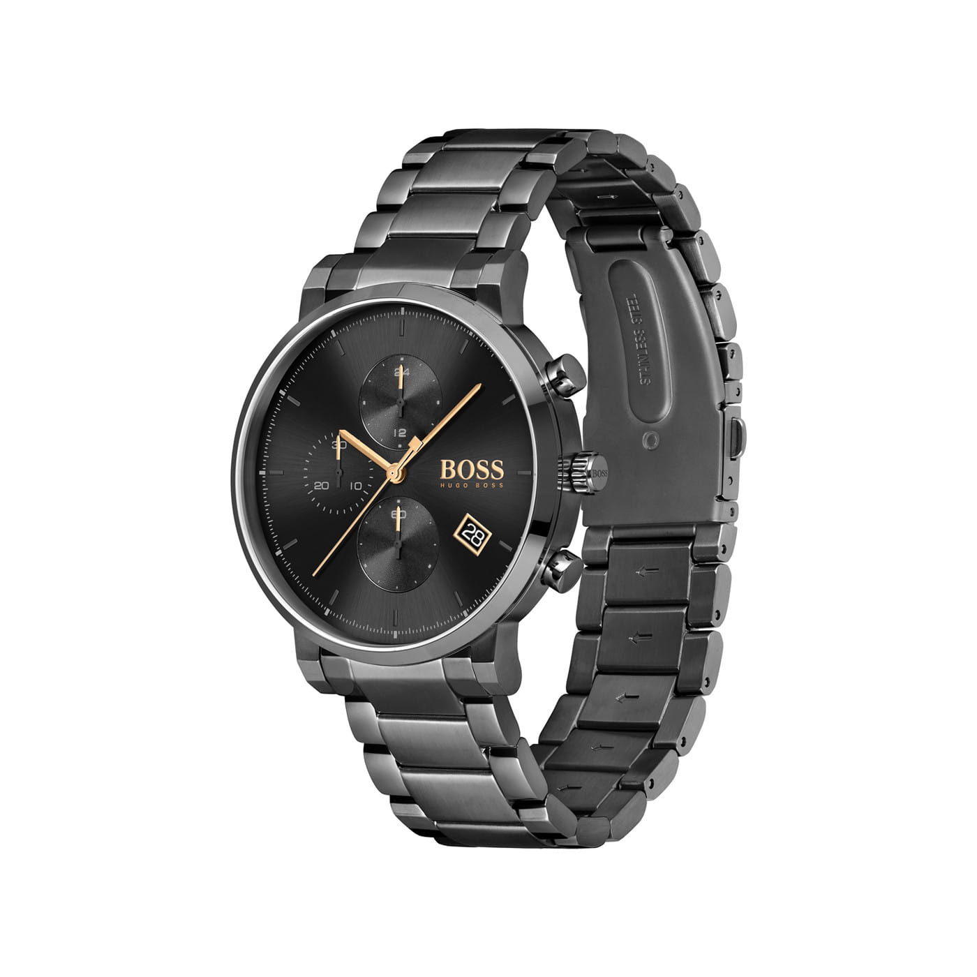 Мужские элегантные часы Hugo Boss Integrity HB1513780 представлены в круглом 43-мм корпусе из нержавеющей стали с IP-покрытиемIP-покрытиеМетод ионного напыления. Демонстрирует повышенную устойчивость к истиранию, окислению и химическим веществам. Под воздействием высокого давления и температуры около 1500°C молекулы металла надёжно соединяются с частицами корпуса часов., оснащены высокоточным кварцевым механизмом с функциями хронографаХронографФункция позволяет измерять отрезки времени с особой точностью: часы, минуты, секунды. Верным признаком хронографа является наличие на циферблате 3 дополнительных окошек-счётчиков., секундомераСекундомерСекундоме́р — прибор, способный измерять интервалы времени с точностью до долей секунды. и индикацией даты на позиции 4 часа. Черный изысканный циферблат с контрастными золотистыми стрелками защищен устойчивым к царапинам минеральным стекломМинеральное стеклоМинеральное стекло представляет собой искусственно выращенный минерал кварца. Такое стекло отличается особой устойчивостью к повреждениям и царапинам. Уступает по некоторым качествам сапфировому стеклу.. Браслет из стали с IP-покрытиемIP-покрытиеМетод ионного напыления. Демонстрирует повышенную устойчивость к истиранию, окислению и химическим веществам. Под воздействием высокого давления и температуры около 1500°C молекулы металла надёжно соединяются с частицами корпуса часов. дополнен раскладной застёжкойРаскладная застёжкаТакой тип застёжки используется только на браслетах из металла. Она никогда не раскрывается полностью, происходит разделение на 2 и более частей. Раскладывающая застёжка снизит вероятность потери часов к минимуму.. Водонепроницаемость 50 метров (5 ATM) обеспечивает защиту от брызг воды и дождя. Точность хода составляет ±15 секунд в месяц, что соответствует стандартам кварцевых механизмов. Эти часы не только практичны, но и станут стильным дополнением вашего гардероба, подчеркивая вашу уверенность и внимание к деталям.