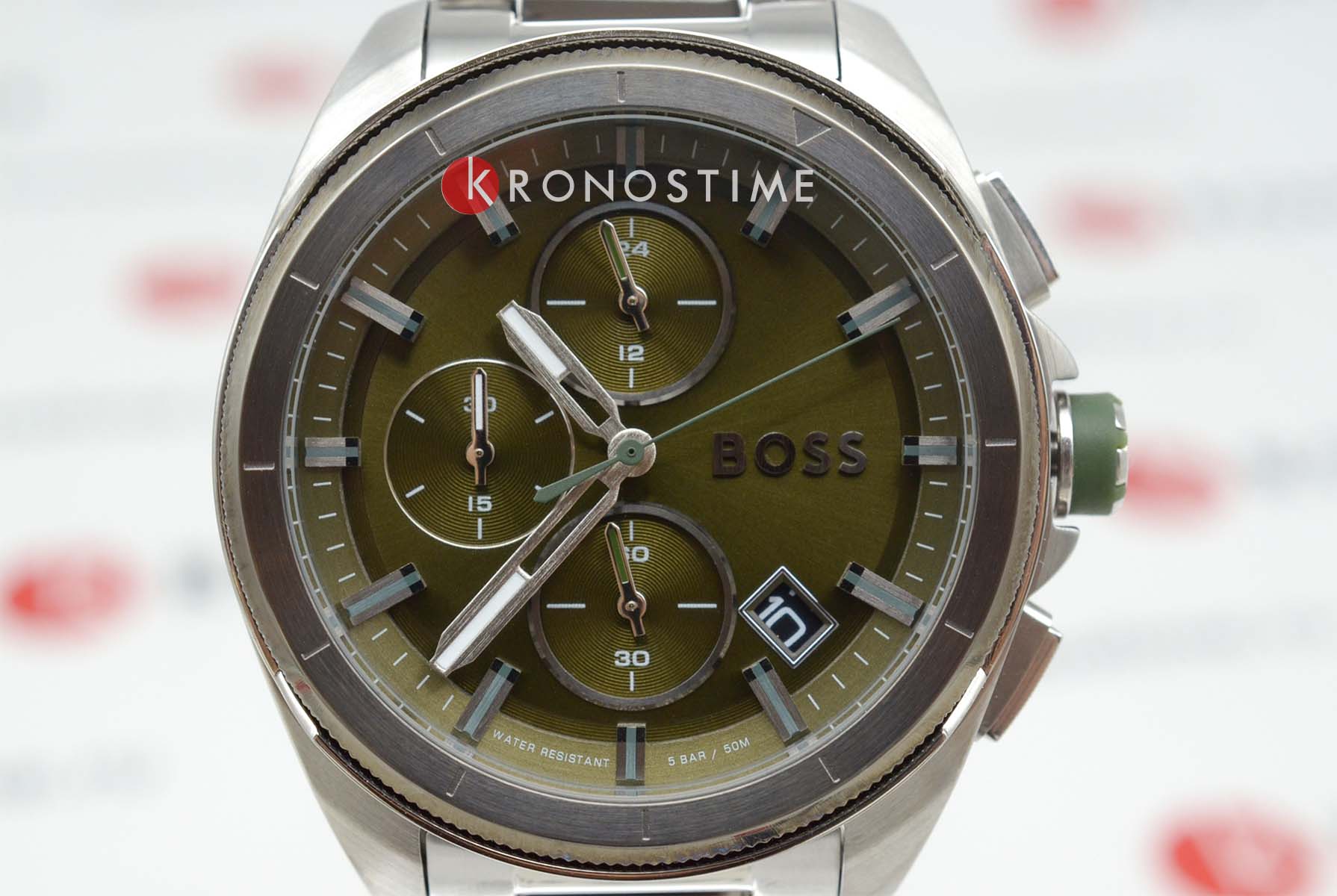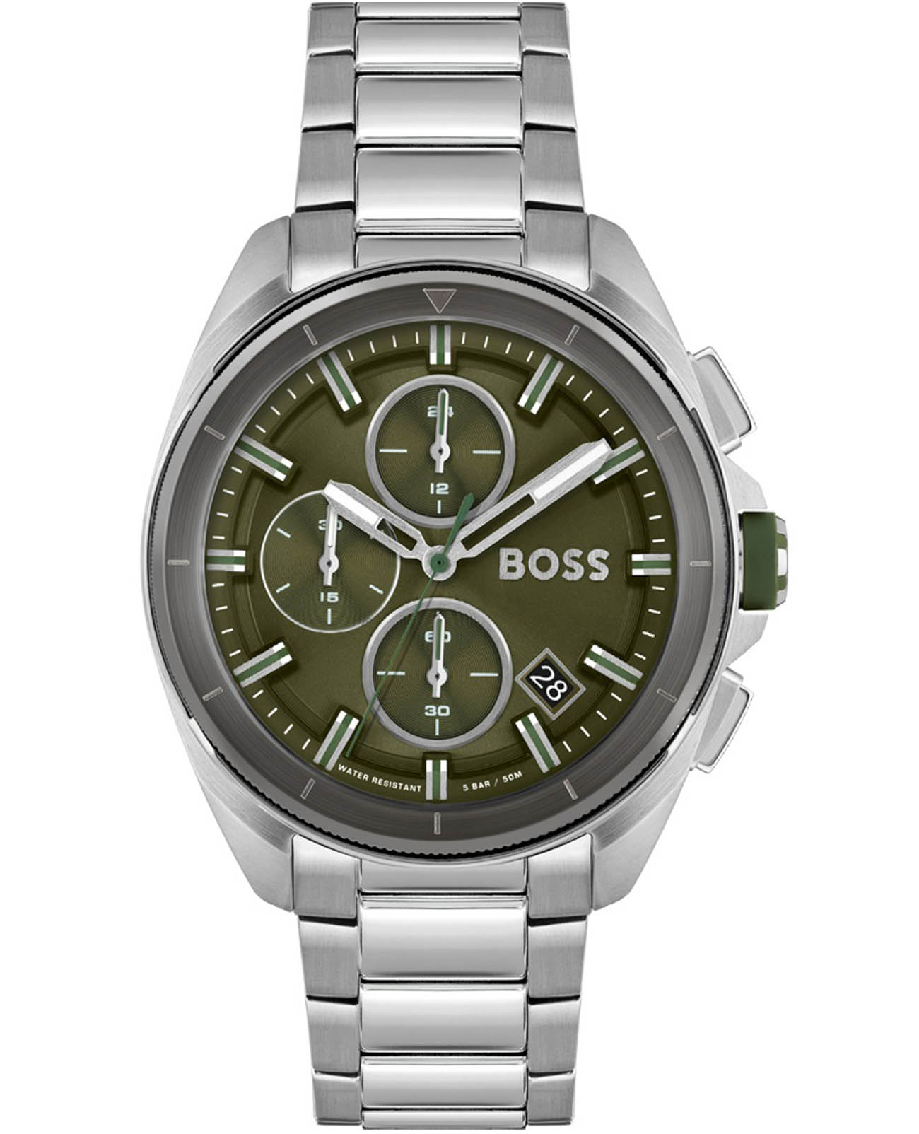 Мужские часы Hugo Boss Volane HB 1513951 представлены в круглом 44-мм корпусе из нержавеющей стали. Оснащены кварцевым механизмом с функциями хронографаХронографФункция позволяет измерять отрезки времени с особой точностью: часы, минуты, секунды. Верным признаком хронографа является наличие на циферблате 3 дополнительных окошек-счётчиков. и секундомеромСекундомерСекундоме́р — прибор, способный измерять интервалы времени с точностью до долей секунды.. Зеленый циферблат защищен устойчивым к царапинам минеральным стекломМинеральное стеклоМинеральное стекло представляет собой искусственно выращенный минерал кварца. Такое стекло отличается особой устойчивостью к повреждениям и царапинам. Уступает по некоторым качествам сапфировому стеклу.. Стальной браслет серебристого цвета дополнен раскладной застёжкойРаскладная застёжкаТакой тип застёжки используется только на браслетах из металла. Она никогда не раскрывается полностью, происходит разделение на 2 и более частей. Раскладывающая застёжка снизит вероятность потери часов к минимуму., а стрелки покрыты люминесцентным составомЛюминесцентное покрытиеПозволяет считывать показания времени в темноте. Производители наносят на стрелки, часовые индексы, безель или поверхность циферблата светонакопительный состав, дающий холодное свечение. для видимости в темноте. Водонепроницаемость 100 метров (10 ATM) позволяет использовать часы для плавания.