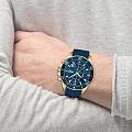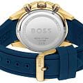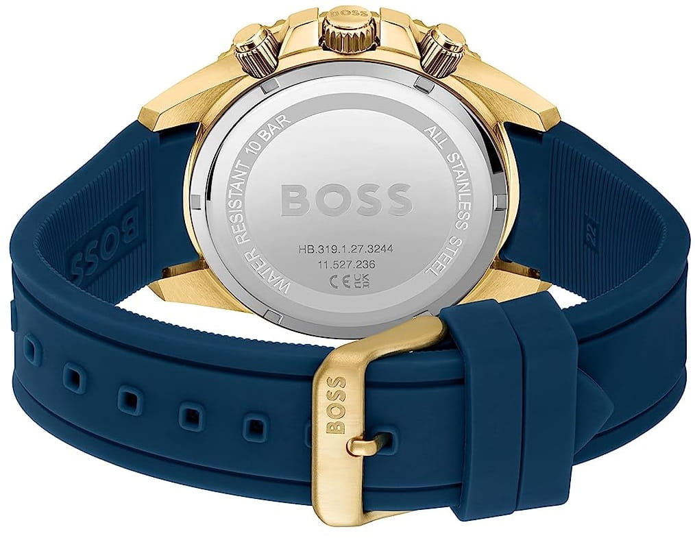 Мужские часы Hugo Boss Admiral HB1513965 представлены в круглом 46-мм корпусе из нержавеющей стали с желтым и синим IP-покрытиемIP-покрытиеМетод ионного напыления. Демонстрирует повышенную устойчивость к истиранию, окислению и химическим веществам. Под воздействием высокого давления и температуры около 1500°C молекулы металла надёжно соединяются с частицами корпуса часов.. Оснащены кварцевым механизмом с функциями хронографаХронографФункция позволяет измерять отрезки времени с особой точностью: часы, минуты, секунды. Верным признаком хронографа является наличие на циферблате 3 дополнительных окошек-счётчиков. и секундомеромСекундомерСекундоме́р — прибор, способный измерять интервалы времени с точностью до долей секунды. на безелеБезельВнешний ободок, закрепляющий стекло. В спортивных часах так называется поворотное кольцо с делениями на циферблате, выполняет роль таймера – замеряет отрезки времени на шкале. Неподвижный безель – элемент декора. Однонаправленно вращающийся безель на дайверских часах позволяет фиксировать моменты погружения и выныривания на поверхность.. Синий циферблат защищен устойчивым к царапинам минеральным стекломМинеральное стеклоМинеральное стекло представляет собой искусственно выращенный минерал кварца. Такое стекло отличается особой устойчивостью к повреждениям и царапинам. Уступает по некоторым качествам сапфировому стеклу.. Силиконовый ремешок дополнен стандартной застежкой, а стрелки покрыты люминесцентным составомЛюминесцентное покрытиеПозволяет считывать показания времени в темноте. Производители наносят на стрелки, часовые индексы, безель или поверхность циферблата светонакопительный состав, дающий холодное свечение. для видимости в темноте. Водонепроницаемость 100 метров (10 ATM) позволяет использовать часы для плавания.
