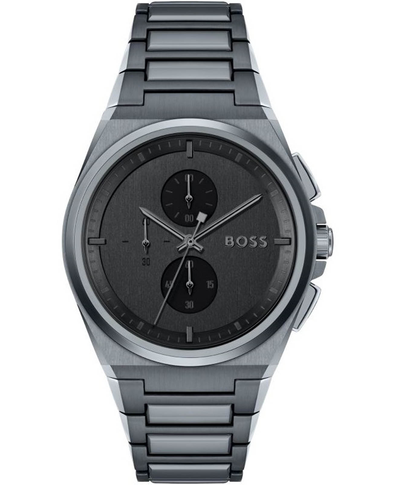 Мужские часы Hugo Boss Steer HB1513996 представлены в круглом 44-мм корпусе из нержавеющей стали с IP-покрытиемIP-покрытиеМетод ионного напыления. Демонстрирует повышенную устойчивость к истиранию, окислению и химическим веществам. Под воздействием высокого давления и температуры около 1500°C молекулы металла надёжно соединяются с частицами корпуса часов.. Оснащены кварцевым механизмом с функциями хронографаХронографФункция позволяет измерять отрезки времени с особой точностью: часы, минуты, секунды. Верным признаком хронографа является наличие на циферблате 3 дополнительных окошек-счётчиков., секундомеромСекундомерСекундоме́р — прибор, способный измерять интервалы времени с точностью до долей секунды.. Черный циферблат защищен устойчивым к царапинам минеральным стекломМинеральное стеклоМинеральное стекло представляет собой искусственно выращенный минерал кварца. Такое стекло отличается особой устойчивостью к повреждениям и царапинам. Уступает по некоторым качествам сапфировому стеклу.. Браслет из нержавеющей стали с IP-покрытиемIP-покрытиеМетод ионного напыления. Демонстрирует повышенную устойчивость к истиранию, окислению и химическим веществам. Под воздействием высокого давления и температуры около 1500°C молекулы металла надёжно соединяются с частицами корпуса часов. дополнен раскладной застёжкойРаскладная застёжкаТакой тип застёжки используется только на браслетах из металла. Она никогда не раскрывается полностью, происходит разделение на 2 и более частей. Раскладывающая застёжка снизит вероятность потери часов к минимуму.. Водонепроницаемость 50 метров (5 ATM) позволяет использовать часы для плавания.