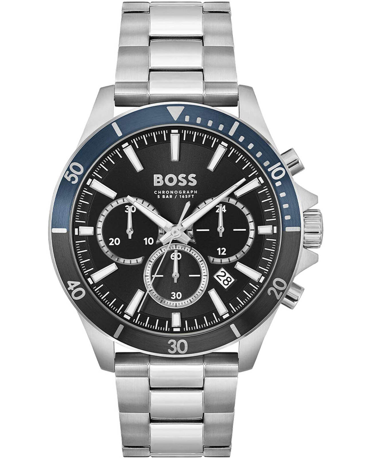 Мужские часы Hugo Boss Troper HB1514101 представлены в круглом 44-мм корпусе из нержавеющей стали с IP-покрытиемIP-покрытиеМетод ионного напыления. Демонстрирует повышенную устойчивость к истиранию, окислению и химическим веществам. Под воздействием высокого давления и температуры около 1500°C молекулы металла надёжно соединяются с частицами корпуса часов.. Оснащены кварцевым механизмом с функциями хронографаХронографФункция позволяет измерять отрезки времени с особой точностью: часы, минуты, секунды. Верным признаком хронографа является наличие на циферблате 3 дополнительных окошек-счётчиков. и секундомеромСекундомерСекундоме́р — прибор, способный измерять интервалы времени с точностью до долей секунды.. Черный циферблат защищен устойчивым к царапинам минеральным стекломМинеральное стеклоМинеральное стекло представляет собой искусственно выращенный минерал кварца. Такое стекло отличается особой устойчивостью к повреждениям и царапинам. Уступает по некоторым качествам сапфировому стеклу.. Браслет из нержавеющей стали дополнен раскладной застёжкойРаскладная застёжкаТакой тип застёжки используется только на браслетах из металла. Она никогда не раскрывается полностью, происходит разделение на 2 и более частей. Раскладывающая застёжка снизит вероятность потери часов к минимуму.. Водонепроницаемость 50 метров (5 ATM) позволяет использовать часы для плавания.