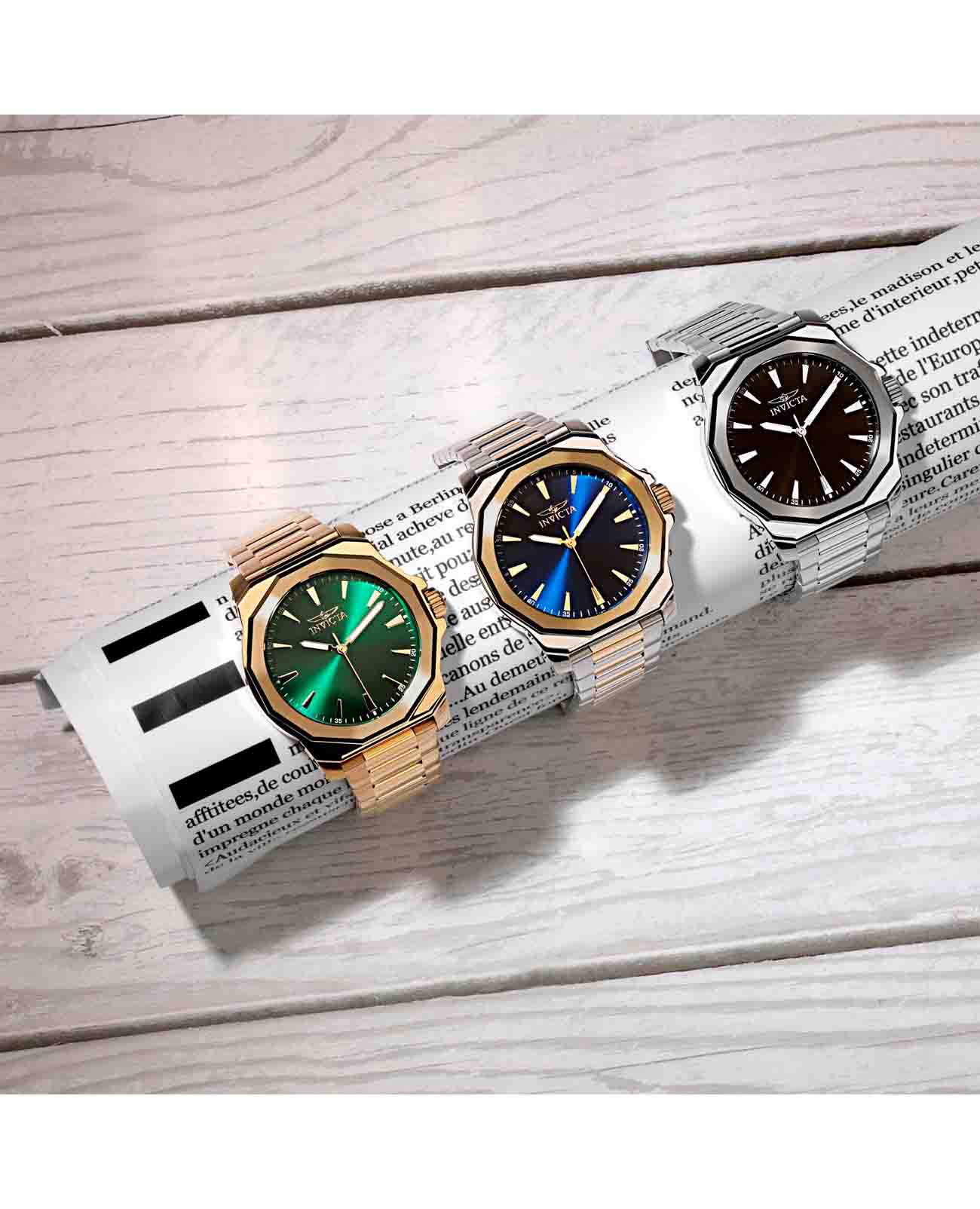 Мужские наручные часы Invicta IN46838, сочетающей в себе стильный дизайн и надежность современных технологий, обладают круглым корпусом, изготовленным из качественной стали, что обеспечивает устойчивость к внешним воздействиям. БезельБезельВнешний ободок, закрепляющий стекло. В спортивных часах так называется поворотное кольцо с делениями на циферблате, выполняет роль таймера – замеряет отрезки времени на шкале. Неподвижный безель – элемент декора. Однонаправленно вращающийся безель на дайверских часах позволяет фиксировать моменты погружения и выныривания на поверхность. с IP-покрытиемIP-покрытиеМетод ионного напыления. Демонстрирует повышенную устойчивость к истиранию, окислению и химическим веществам. Под воздействием высокого давления и температуры около 1500°C молекулы металла надёжно соединяются с частицами корпуса часов.. Модель оснащена синим циферблатом, который гармонично дополняет минеральное стеклоМинеральное стеклоМинеральное стекло представляет собой искусственно выращенный минерал кварца. Такое стекло отличается особой устойчивостью к повреждениям и царапинам. Уступает по некоторым качествам сапфировому стеклу., прошедшее специальную закалку для придания большей прочности . Браслет выполнен так же из стали с частичным IP-покрытиемIP-покрытиеМетод ионного напыления. Демонстрирует повышенную устойчивость к истиранию, окислению и химическим веществам. Под воздействием высокого давления и температуры около 1500°C молекулы металла надёжно соединяются с частицами корпуса часов.
