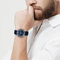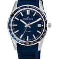 тахиметраТахиметрРазмеченная шкала, располагается на ободке или безеле часов. Тахиметр позволяет рассчитать скорость на определённом участке пути, расстояние измеряется в километрах или милях. вынесена на безельБезельВнешний ободок, закрепляющий стекло. В спортивных часах так называется поворотное кольцо с делениями на циферблате, выполняет роль таймера – замеряет отрезки времени на шкале. Неподвижный безель – элемент декора. Однонаправленно вращающийся безель на дайверских часах позволяет фиксировать моменты погружения и выныривания на поверхность.. В часах установлено ударопрочное минеральное стеклоМинеральное стеклоМинеральное стекло представляет собой искусственно выращенный минерал кварца. Такое стекло отличается особой устойчивостью к повреждениям и царапинам. Уступает по некоторым качествам сапфировому стеклу. Crystex. Повышенная водостойкость равна 10 атмосфер. Для создания ремешка был выбран силикон синего цвета. Силиконовый ремешок не деформируется со временем, не боится повышенной влажности и позволяет коже запястья дышать.