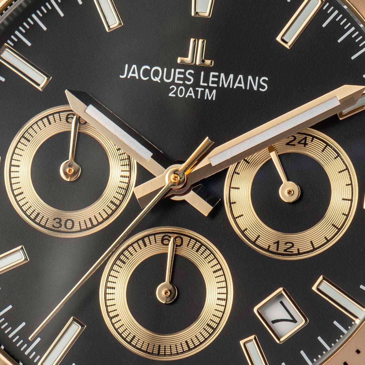 Мужские часы Jacques Lemans Liverpool 1-1877H с минеральным стекломМинеральное стеклоМинеральное стекло представляет собой искусственно выращенный минерал кварца. Такое стекло отличается особой устойчивостью к повреждениям и царапинам. Уступает по некоторым качествам сапфировому стеклу., кварцевый механизм с высокой точностью. Часы- хронографХронографФункция позволяет измерять отрезки времени с особой точностью: часы, минуты, секунды. Верным признаком хронографа является наличие на циферблате 3 дополнительных окошек-счётчиков. с секундомеромСекундомерСекундоме́р — прибор, способный измерять интервалы времени с точностью до долей секунды. представляют собой стильный аксессуар, отражающий идеальное сочетание современного дизайна, надёжности и функциональности.  Неподвижный безельБезельВнешний ободок, закрепляющий стекло. В спортивных часах так называется поворотное кольцо с делениями на циферблате, выполняет роль таймера – замеряет отрезки времени на шкале. Неподвижный безель – элемент декора. Однонаправленно вращающийся безель на дайверских часах позволяет фиксировать моменты погружения и выныривания на поверхность. из нержавеющей стали с PVDPVDУльтратонкое покрытие наносится в технике вакуумного напыления, сочетает в себе нитрид титана особой прочности со слоем золота или оксида хрома. Несёт в себе декоративную или защитную функцию. покрытием и с тахиметромТахиметрРазмеченная шкала, располагается на ободке или безеле часов. Тахиметр позволяет рассчитать скорость на определённом участке пути, расстояние измеряется в километрах или милях.. На циферблате расположены два дополнительных индикатора и окошко даты. Стрелки и метки с люминесцентным покрытиемЛюминесцентное покрытиеПозволяет считывать показания времени в темноте. Производители наносят на стрелки, часовые индексы, безель или поверхность циферблата светонакопительный состав, дающий холодное свечение.. Класс водозащиты: 200 метров, позволит плавать, нырять и заниматься другими водными видами спорта. Рифленая заводная головка с защитой. Браслет из нержавеющей стали на раскладной застёжкеРаскладная застёжкаТакой тип застёжки используется только на браслетах из металла. Она никогда не раскрывается полностью, происходит разделение на 2 и более частей. Раскладывающая застёжка снизит вероятность потери часов к минимуму..