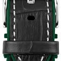 Кварцевый хронографХронографФункция позволяет измерять отрезки времени с особой точностью: часы, минуты, секунды. Верным признаком хронографа является наличие на циферблате 3 дополнительных окошек-счётчиков. в мощном корпусе диаметром 48 мм. Нержавеющая сталь, из которой он сделан, отличается гипоаллергенными свойствами и стойкостью к коррозии. Широкий контрастный безельБезельВнешний ободок, закрепляющий стекло. В спортивных часах так называется поворотное кольцо с делениями на циферблате, выполняет роль таймера – замеряет отрезки времени на шкале. Неподвижный безель – элемент декора. Однонаправленно вращающийся безель на дайверских часах позволяет фиксировать моменты погружения и выныривания на поверхность. с тахиметрической шкалой обрамляет зеленый циферблат. На нем расположены три дополнительных индикатора и окошко даты. С помощью индикаторов можно засекать временные промежутки (секунды и минуты) и определять время в 24-часовом формате времяисчисления. В модели установлено минеральное стеклоМинеральное стеклоМинеральное стекло представляет собой искусственно выращенный минерал кварца. Такое стекло отличается особой устойчивостью к повреждениям и царапинам. Уступает по некоторым качествам сапфировому стеклу.. Повышенная водостойкость равна 10 атмосфер. Ремешок выполнен из натуральной кожи черного цвета с прошивкой, застежка украшена логотипом бренда. Часы Jacques Lemans, надежные и функциональные, хорошо дополнят образ в спортивном или повседневном стиле.