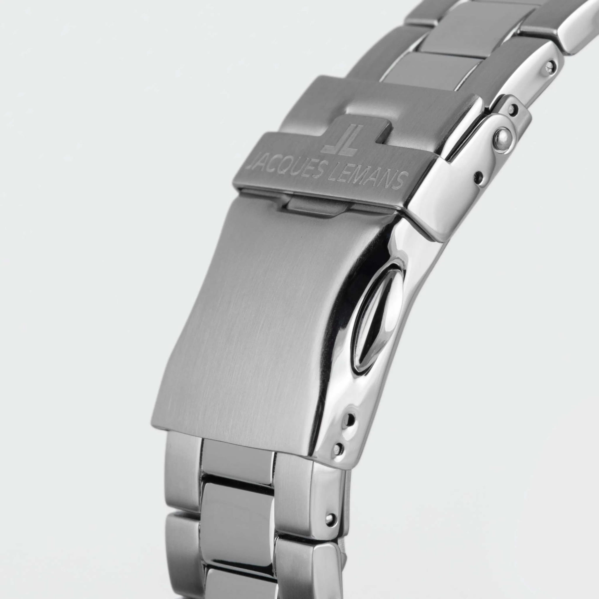 Мужские кварцевые часы-хронографХронографФункция позволяет измерять отрезки времени с особой точностью: часы, минуты, секунды. Верным признаком хронографа является наличие на циферблате 3 дополнительных окошек-счётчиков. с секундомеромСекундомерСекундоме́р — прибор, способный измерять интервалы времени с точностью до долей секунды. Jacques Lemans 1-2207E – лаконичная красота и изысканная элегантность. Оригинальная модель с классическим оформлением станет превосходным завершением образа, наделив его индивидуальным характером. Корпус выполнен из нержавеющей стали серебристого цвета, диаметром 43 мм, что обеспечивает долговечность и утончённый внешний вид. Минеральное стеклоМинеральное стеклоМинеральное стекло представляет собой искусственно выращенный минерал кварца. Такое стекло отличается особой устойчивостью к повреждениям и царапинам. Уступает по некоторым качествам сапфировому стеклу. повышенной прочности Crystex защищает циферблат от царапин. Неподвижный безельБезельВнешний ободок, закрепляющий стекло. В спортивных часах так называется поворотное кольцо с делениями на циферблате, выполняет роль таймера – замеряет отрезки времени на шкале. Неподвижный безель – элемент декора. Однонаправленно вращающийся безель на дайверских часах позволяет фиксировать моменты погружения и выныривания на поверхность. с PVD-покрытиемPVDУльтратонкое покрытие наносится в технике вакуумного напыления, сочетает в себе нитрид титана особой прочности со слоем золота или оксида хрома. Несёт в себе декоративную или защитную функцию. и тахиметромТахиметрРазмеченная шкала, располагается на ободке или безеле часов. Тахиметр позволяет рассчитать скорость на определённом участке пути, расстояние измеряется в километрах или милях.. Стальной браслет на раскладной застёжке с фиксаторомРаскладная застёжкаТакой тип застёжки используется только на браслетах из металла. Она никогда не раскрывается полностью, происходит разделение на 2 и более частей. Раскладывающая застёжка снизит вероятность потери часов к минимуму. обеспечивает комфортное ношение Водозащита 200 метров позволит плавать, нырять и заниматься другими водными видами спорта. Стрелки и метки с люминесцентным покрытиемЛюминесцентное покрытиеПозволяет считывать показания времени в темноте. Производители наносят на стрелки, часовые индексы, безель или поверхность циферблата светонакопительный состав, дающий холодное свечение. позволяющие легко определять время даже в темноте. 12-ти и 24-х часовой формат времени. Окошко даты находится в положении между 4 и 5 часами. Рифленая заводная головка с защитой. Это аксессуар для мужчины, который ценит классический стиль и функциональность.
