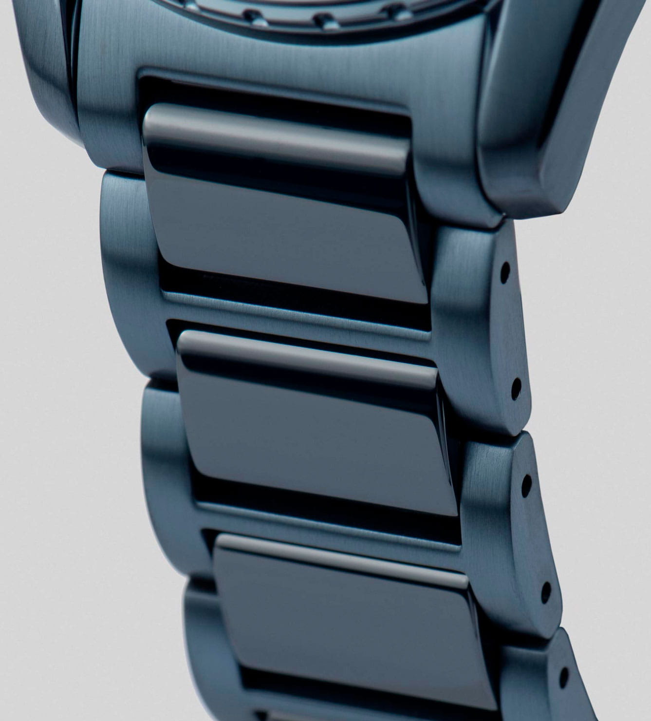 Часы с явными спортивными акцентами могут выглядеть элегантно. Крупный корпус диаметром 42 мм сделан из нержавеющей стали с PVD-покрытиемPVDУльтратонкое покрытие наносится в технике вакуумного напыления, сочетает в себе нитрид титана особой прочности со слоем золота или оксида хрома. Несёт в себе декоративную или защитную функцию., на широкий безельБезельВнешний ободок, закрепляющий стекло. В спортивных часах так называется поворотное кольцо с делениями на циферблате, выполняет роль таймера – замеряет отрезки времени на шкале. Неподвижный безель – элемент декора. Однонаправленно вращающийся безель на дайверских часах позволяет фиксировать моменты погружения и выныривания на поверхность. вынесена дополнительная индикация. Точный кварцевый механизм отвечает за движение хорошо читаемых стрелок, покрытых люминесцентным составомЛюминесцентное покрытиеПозволяет считывать показания времени в темноте. Производители наносят на стрелки, часовые индексы, безель или поверхность циферблата светонакопительный состав, дающий холодное свечение.. Таким же образом выделены и индексы, поэтому время по этим часам легко определить даже в темноте. В положении «3 часа» находится окошко даты. Еще одна спортивная составляющая — повышенная водостойкость, равная 10 атмосфер: в часах можно плавать. Вместе с этим, модель идеально впишется и в классический образ, и в повседневный. Особая деталь — звенья браслета из высокотехнологичной керамикиВысокотехнологичная керамикаИнновационный запатентованный Rado материал с гладкой или матовой поверхностью. Керамика за счёт кристаллической структуры обладает повышенной устойчивостью от возникновения царапин. Материал способен принимать температуру тела человека, обеспечивая невероятный комфорт при ношении. синего цвета, в тон циферблату. Этот материал удобно носить даже в мороз: он быстро нагревается до комфортной температуры тела. К тому же, керамика стойко сопротивляется появлению микроцарапин. На браслет установлена раскладная застёжкаРаскладная застёжкаТакой тип застёжки используется только на браслетах из металла. Она никогда не раскрывается полностью, происходит разделение на 2 и более частей. Раскладывающая застёжка снизит вероятность потери часов к минимуму..