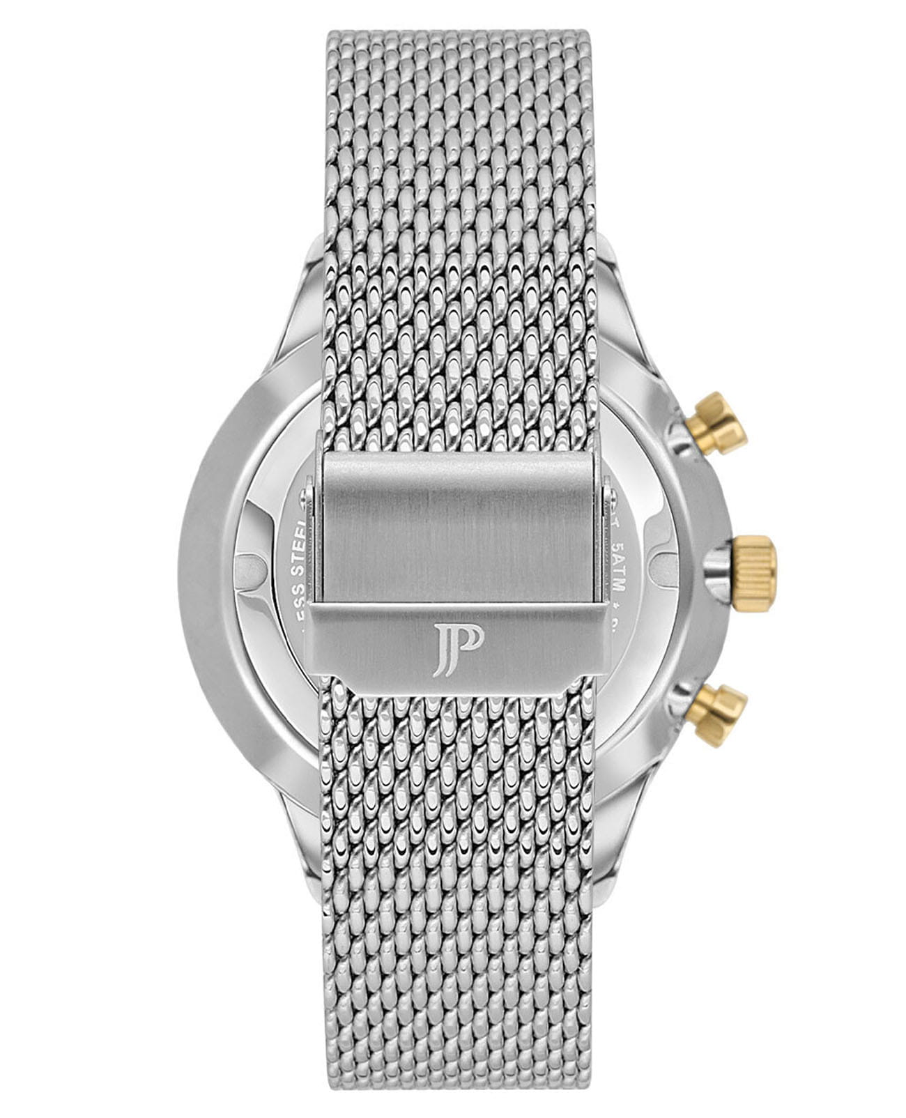 Швейцарские мужские часы-хронографХронографФункция позволяет измерять отрезки времени с особой точностью: часы, минуты, секунды. Верным признаком хронографа является наличие на циферблате 3 дополнительных окошек-счётчиков. Jacques Philippe Gallant JPQGC031236, кварцевый механизм с высокой точностью. Сапфировое стеклоСапфировое стеклоПрочный и надёжный материал из кристалла сапфира синтетического происхождения, характеризующийся особой твёрдостью и устойчивостью к царапинам и повреждениям. устойчивое к появлению царапин, обладающее высокой прозрачностью. Корпус часов изготовлен из нержавеющей стали. На циферблате три дополнительных индикатора. Стрелки с люминесцентным покрытиемЛюминесцентное покрытиеПозволяет считывать показания времени в темноте. Производители наносят на стрелки, часовые индексы, безель или поверхность циферблата светонакопительный состав, дающий холодное свечение.. Окошко даты находится между 4 и 5 часами. Класс водозащиты: 50 метров, позволит защитить корпус от случайных брызг или капель дождя. Стальной браслет миланского плетения на раскладном замкеРаскладной замокДанный вариант застежки используется только на часах с металлическим браслетом. Отличительная особенность такого крепления в том, что длина браслета становится универсальной и вы можете самостоятельно отрегулировать нужный вам размер – застежка просто двигается по браслету часов..