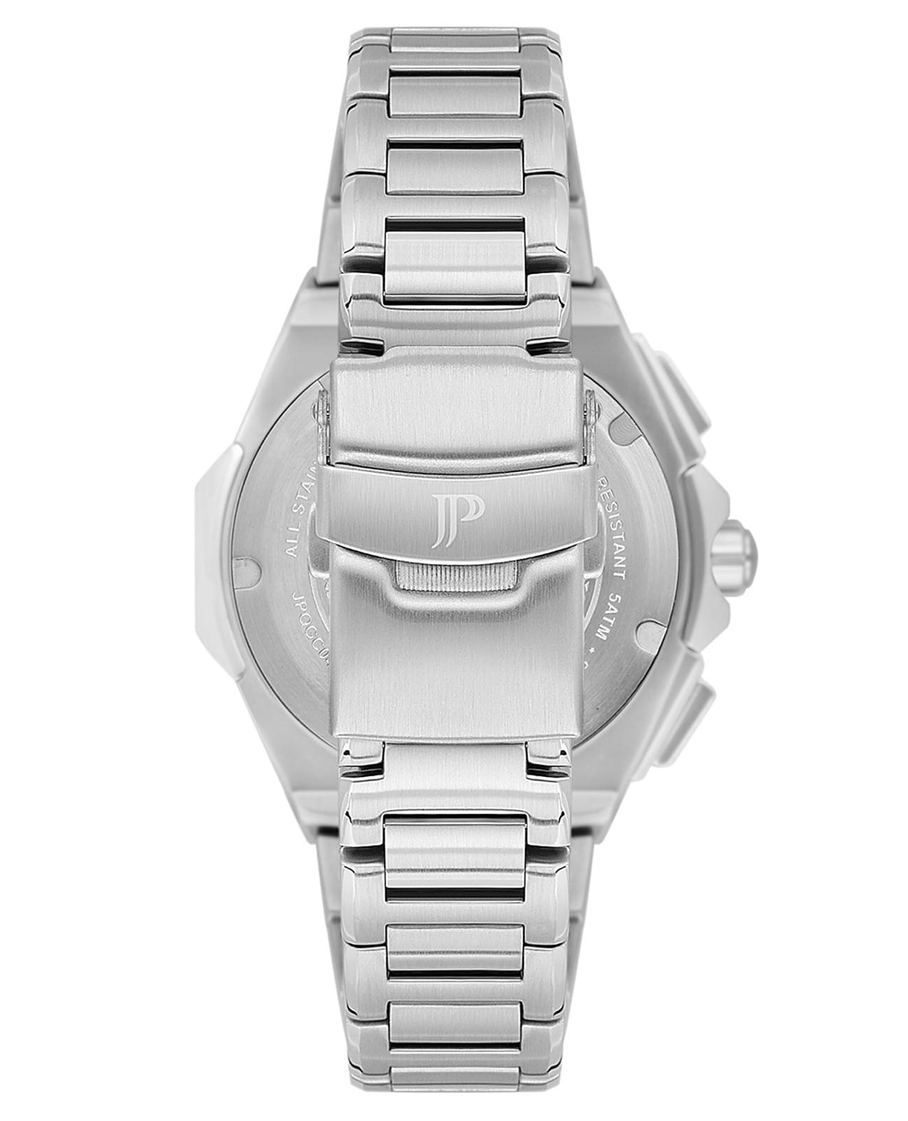 Швейцарские мужские часы-хронографХронографФункция позволяет измерять отрезки времени с особой точностью: часы, минуты, секунды. Верным признаком хронографа является наличие на циферблате 3 дополнительных окошек-счётчиков. с секундомеромСекундомерСекундоме́р — прибор, способный измерять интервалы времени с точностью до долей секунды. Jacques Philippe Esquire JPQGC041316, кварцевый механизм с высокой точностью. Сапфировое стеклоСапфировое стеклоПрочный и надёжный материал из кристалла сапфира синтетического происхождения, характеризующийся особой твёрдостью и устойчивостью к царапинам и повреждениям. устойчивое к появлению царапин, обладающее высокой прозрачностью. Корпус часов изготовлен из нержавеющей стали. На циферблате три дополнительных индикатора. Стрелки с люминесцентным покрытиемЛюминесцентное покрытиеПозволяет считывать показания времени в темноте. Производители наносят на стрелки, часовые индексы, безель или поверхность циферблата светонакопительный состав, дающий холодное свечение.. Шкала тахиметраТахиметрРазмеченная шкала, располагается на ободке или безеле часов. Тахиметр позволяет рассчитать скорость на определённом участке пути, расстояние измеряется в километрах или милях. на циферблате. Класс водозащиты: 50 метров, позволит защитить корпус от случайных брызг или капель дождя. Стальной браслет на раскладной застёжкеРаскладная застёжкаТакой тип застёжки используется только на браслетах из металла. Она никогда не раскрывается полностью, происходит разделение на 2 и более частей. Раскладывающая застёжка снизит вероятность потери часов к минимуму..