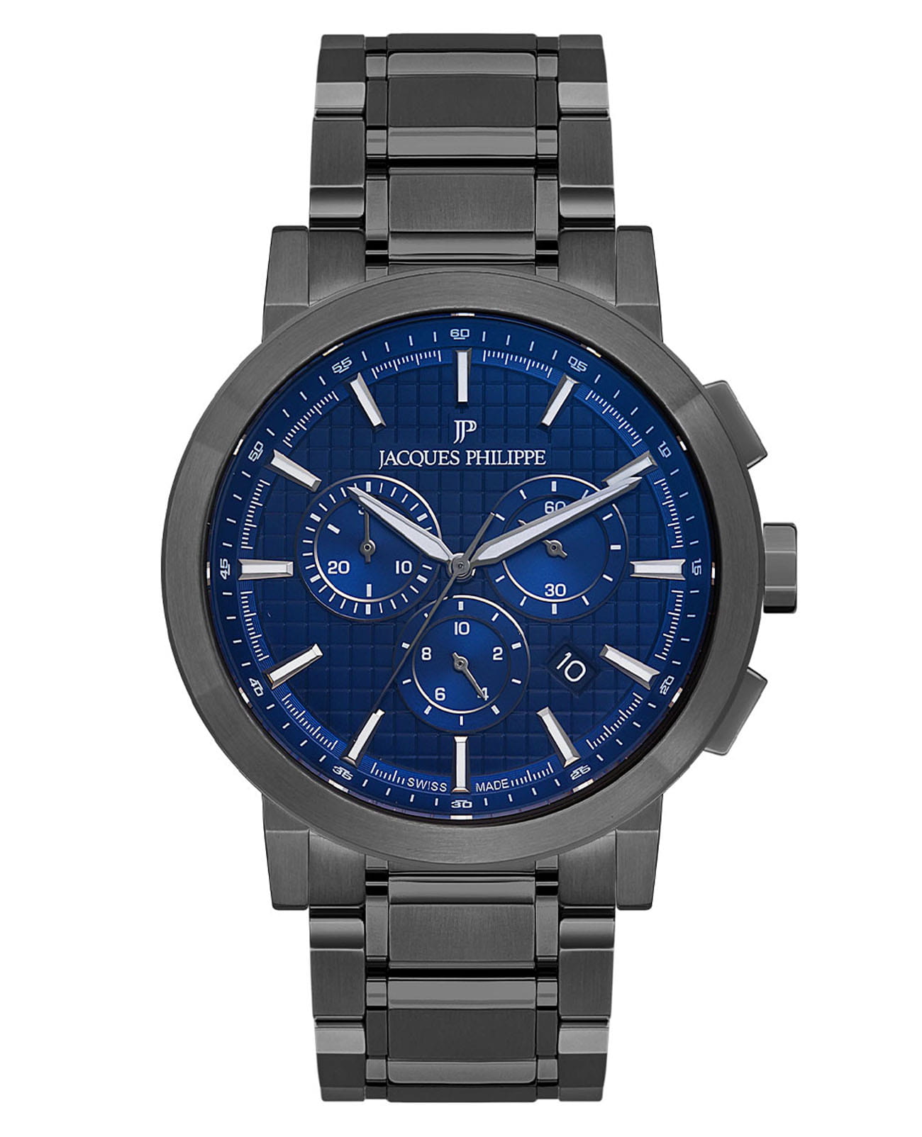 Швейцарские мужские часы-хронографХронографФункция позволяет измерять отрезки времени с особой точностью: часы, минуты, секунды. Верным признаком хронографа является наличие на циферблате 3 дополнительных окошек-счётчиков. с секундомеромСекундомерСекундоме́р — прибор, способный измерять интервалы времени с точностью до долей секунды. Jacques Philippe Round JPQGC178337, кварцевый механизм с высокой точностью. Сапфировое стеклоСапфировое стеклоПрочный и надёжный материал из кристалла сапфира синтетического происхождения, характеризующийся особой твёрдостью и устойчивостью к царапинам и повреждениям. устойчивое к появлению царапин, обладающее высокой прозрачностью. Корпус часов изготовлен из нержавеющей стали. На циферблате три дополнительных индикатора. Стрелки с люминесцентным покрытиемЛюминесцентное покрытиеПозволяет считывать показания времени в темноте. Производители наносят на стрелки, часовые индексы, безель или поверхность циферблата светонакопительный состав, дающий холодное свечение.. Окошко даты находится между 4 и 5 часами. Класс водозащиты: 50 метров, позволит защитить корпус от случайных брызг или капель дождя. Стальной браслет на застёжке «бабочка» с кнопкамиЗастёжка "бабочка"Такой вид застёжки дополняется предохранителями, помогающими избежать случайного раскрытия браслета. Обладают изящным исполнением. .